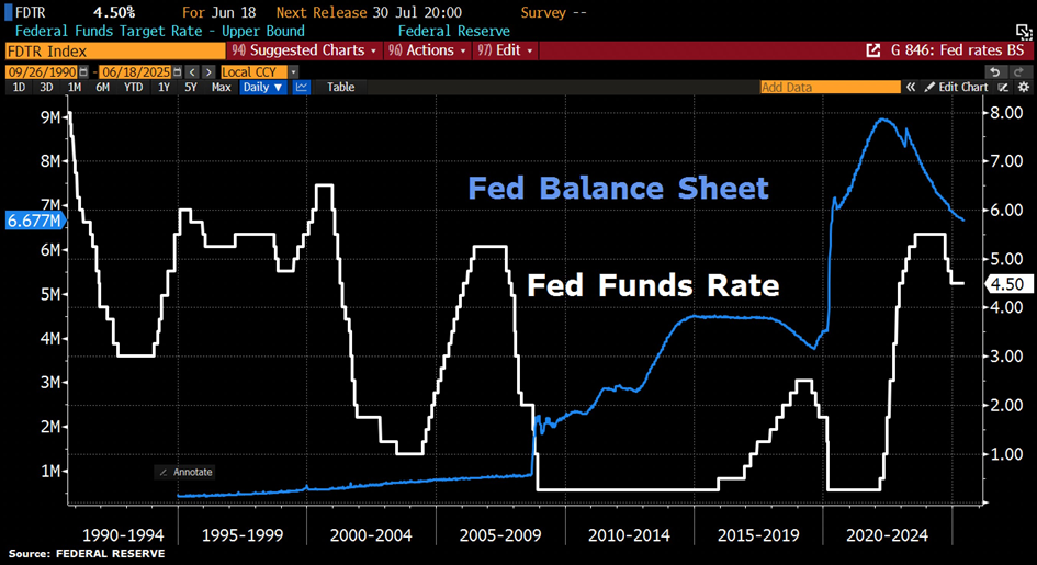 das FED hält bei der heutigen Zinsentscheidung die Füße still und belässt den Leitzins (Fed Funds Rate) beim Zielband 4,25%-4,50% - dennoch sind noch zwei Zinssenkungen bis Jahresende geplant. Das FED senkt die Wachstumsprognose 2025 für das BIP von 1,7% auf 1,4%. Die Inflationsprognose wird auf 3,1% angehoben (im März waren noch 2,8% prognostiziert). |