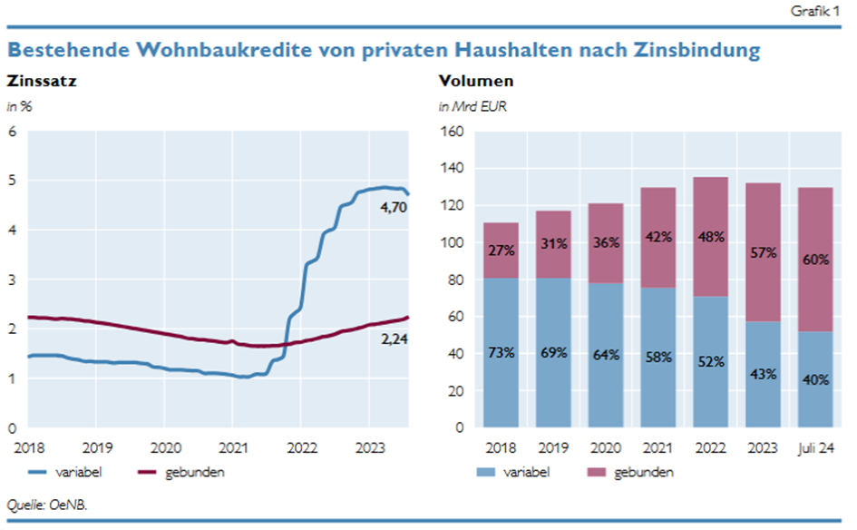 Immobilienfinanzierungen: Aufteilung der Zinsbindungsvarianten ausgewählter EUR-Länder (in "All" ist Österreich enthalten) per Februar 2025 ... und die Aufteilung fix vs. variabel in Ö per Juli 2024: |