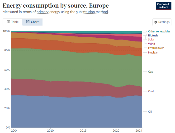 Bei our world in Data gibt es da unglaublich viel... man muss es nur finden... den hab ich eben entdeckt. Leider nur in Prozent angegeben und nicht absoluten Zahlen (Verbrauch ist ja in den letzten 20y massiv angestiegen). Glaub bei Eurostat auf der HP müsste man auch Details finden... Um den Faden nicht zu verwässern, zusammengefasst kann man sagen, die Abhängigkeiten speziell bei Gas/Öl sind enorm und werden es auch die nächsten 10 Jahre + bleiben. |
