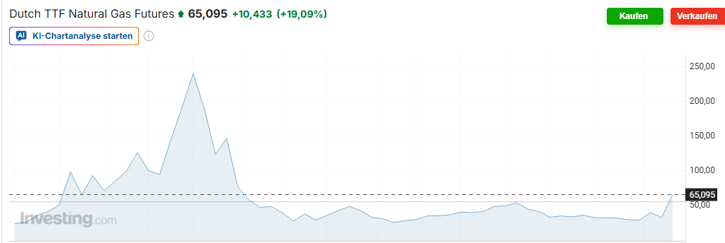 Der Dutch TTF mal eben weitere +30% von gestern auf heute, nachdem Israel das weltweit größte Gasfeld der Welt angegriffen hat. Die Zeichen stehen auf totale Eskalation würde ich meinen, Öl wird vielleicht auch weiter anziehen. |