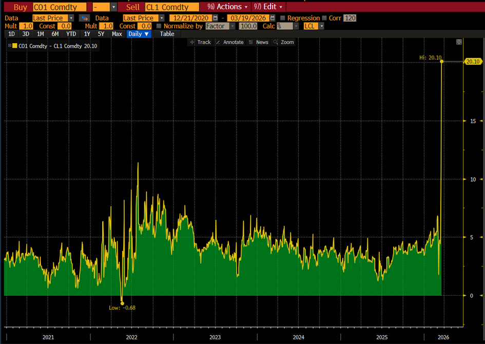 ... tut es auch - und überproportional die Nordseesorte Brent ... ... die je Barrel derzeit auf einer historisch hohen Differenz von USD 20 (sonst rund um USD 5) zum nordamerikanischen WTI (West Texas Intermediate) handelt, da die europäische Ölversorgung durch den Iran-Angriff überproportional betroffen ist. |
