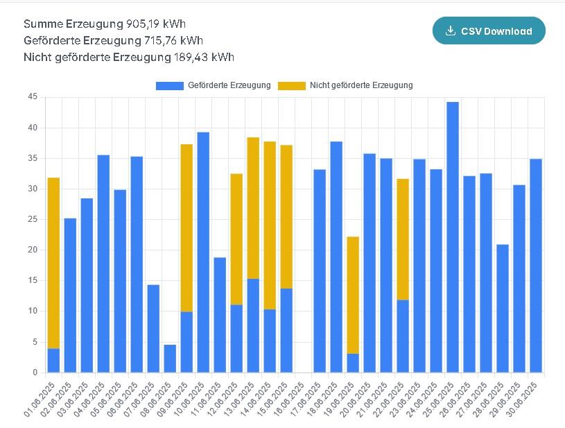15kwp Anlage. Überschusseinspeisung. Ich habe ein 4KVA Einspeiselimit, kann also nur um die 11 Stunden einspeisen ohne den Akku zu nutzen zum einspeisen. Der 25.06. war ein Testtag an dem ich den Akku morgens händisch entladen habe. An diesen Tagen dort in blau bekomme ich: Förderzusage 8,98ct pro kWh, momentaner Referenzmarktwert Cent/kWh 1,61ct. Ergo 7,37ct Förderung pro kWh. Eingespeist wurde im Juni 905kWh. Davon förderfähig 715kWh. Ergo 715kWh*7,37ct = 52,70€ für Juni. In den Monaten Januar, Februar gab es keine Förderung, weil der Referenzmarktwert höher als 8,98ct die kWh war. Was aber schlichtweg egal ist, weil man da fast alles selber verbraucht. Nun nimm mal an, du hast 6 solcher o.g. Monate, speist du 5400kWh ein, förderfähig geschätzt 4000kWh zu durchschnittlich 5ct = 200€ Förderung. 20 Jahre = 4000€. Das ist nur sehr grob. Je mehr PV-Anlagen in Österreich, desto mehr Tage wird es sicher geben, an denen 0ct für mind. 6Std wären. Da bekommt man 0 Förderung. Genauso wenn der Strompreis hoch ginge. Ist der Referenzstrompreis bei über 8,98ct, egal ob du die bekommst! (bei ÖMAG oder sonstwo du deinen Strom verkaufst), gibt es keine Förderung. Es ist also kompliziert. Wie geschrieben, anders sähe es z.B. bei mir aus: Dicker Speicher vollmachen und dann eben abends/nachts einspeisen. Da ist es, bisher, noch nicht so mit den 0ct, also volle Prämie. |