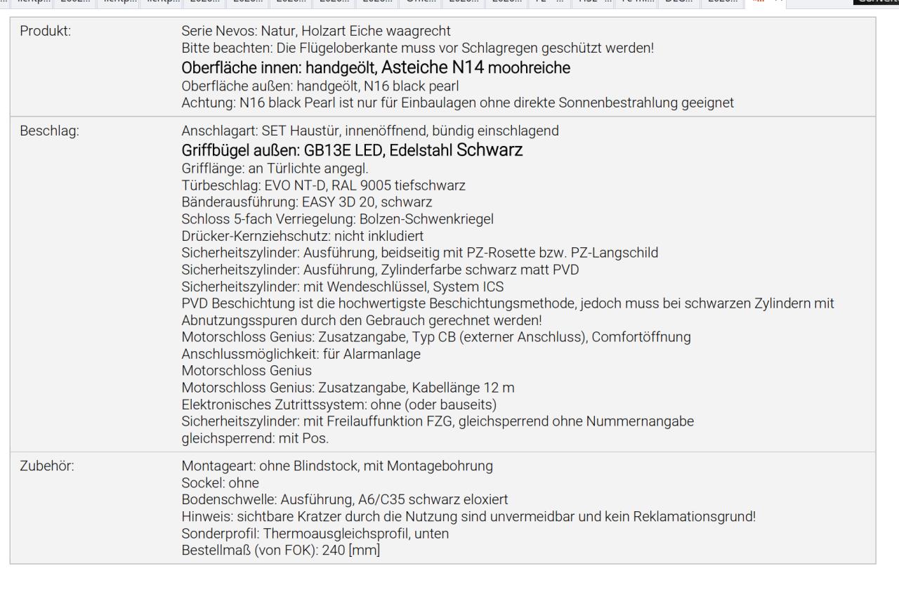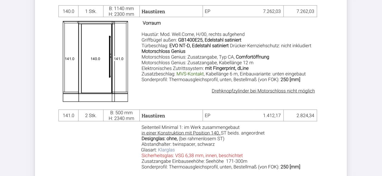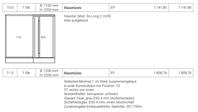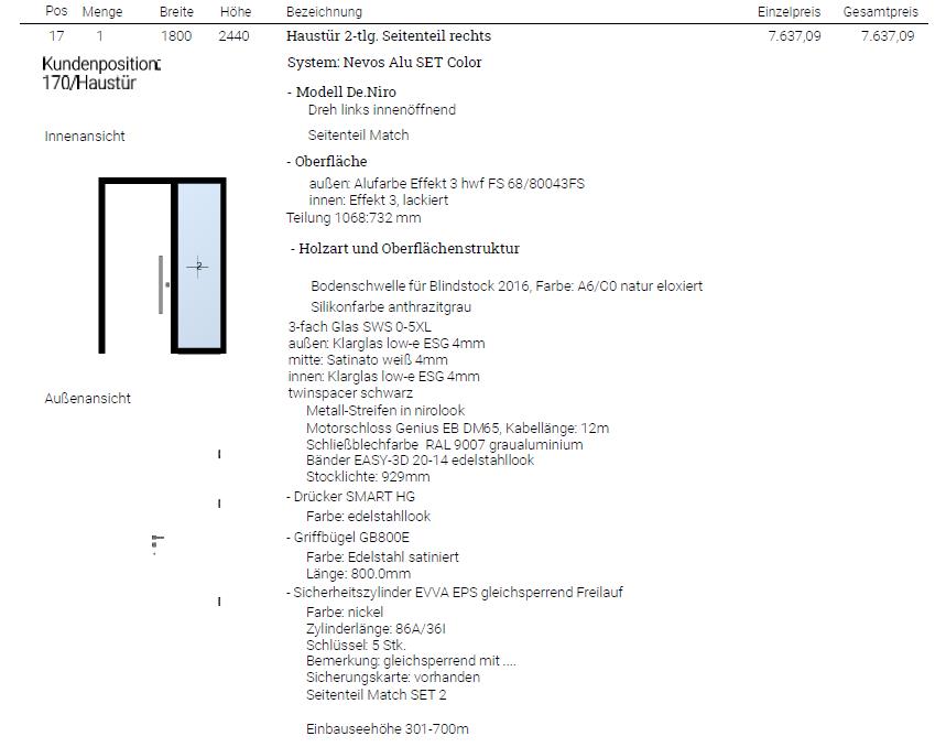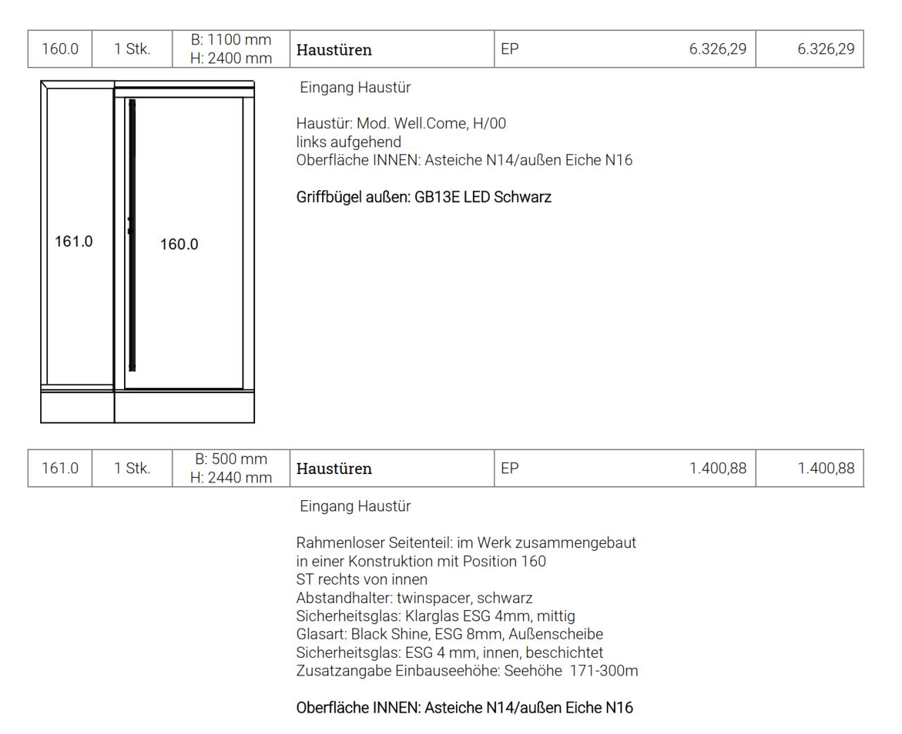 Da fehlen wichtige Informationen, da nichts über Materialen und Oberfläche geschrieben ist. Wir haben das gleiche Modell, aber nur ein Seitenteil, in Eiche/Eiche. Uns ist es den höheren Preis im Vergleich zu Alu-Türen der Wettbewerber wert. Die fanden wir alle hässlich. Wir sind bei netto um die 7k, wenn ich das richtig in Erinnerung habe.