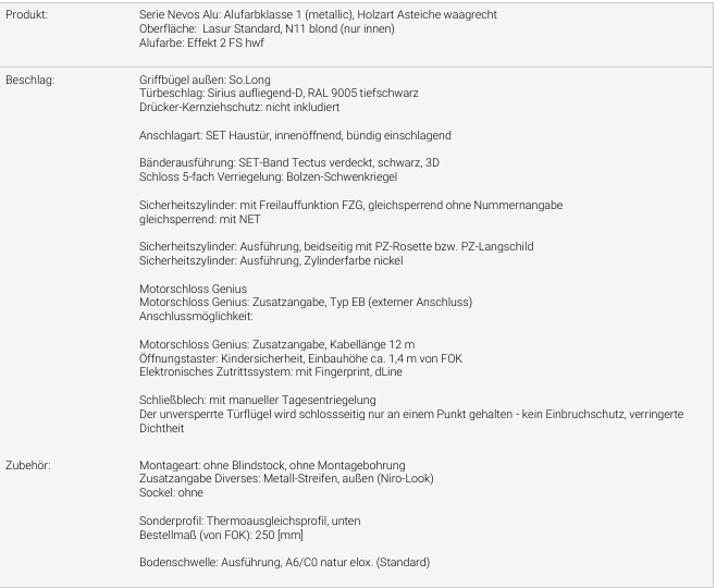 Gerade nochmal nachgeschaut, wir sind mit 1,1m (Tür) + 0,5m (Seitenteil) und 2,4m Höhe bei Holz (Eiche Black Pearl) / Holz (Mohreiche) mit Motorschloss CB und Glastyp Black Shine bei netto 7.7k. Alu wäre deutlich teurer, da die Tür selbst immer aus Holz gefertigt und nur eine Aluschale draufgegeben wird.