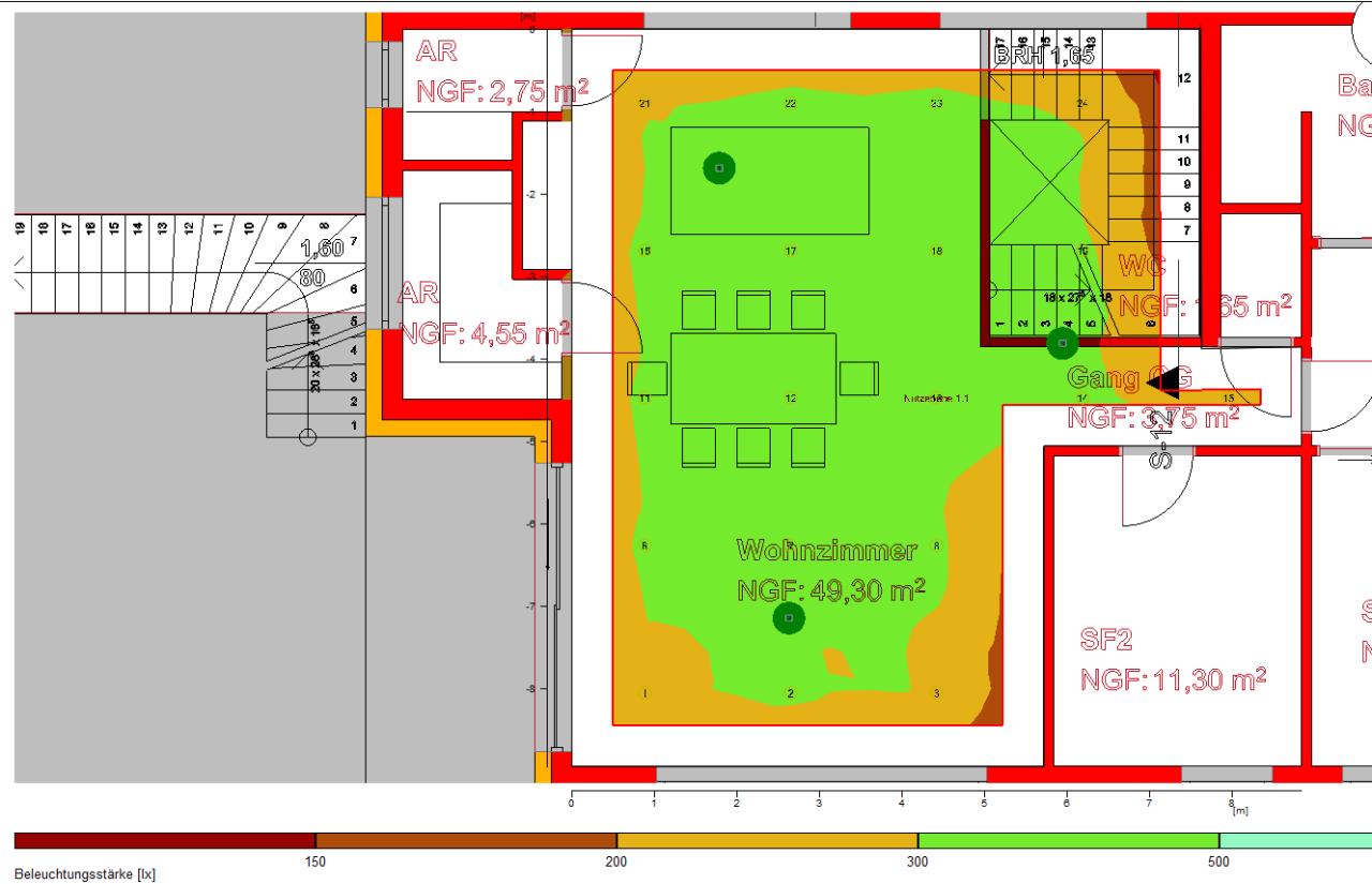 Oder mit der Software https://reluxnet.relux.com/de/relux-desktop.html (ist gratis, wird vermutlich von den Leuchtenherstellern finanziert), mit Importfunktion von über 100.000 Leuchten. Konnte bei mir die CAD-Daten (Grundriss) vom BM importieren. Hier mal ein Bild von meinem Wohnzimmer mit LEDs vom Brumberg http://relux.com/de/search/luminaires/brumberg/brb___led_einbaudownlight/AT/#art=brb___40515&var=---&config=0001&lamp=13-1006-_-1-_-0-4000k-_ und HaloxO 180. Den Schacht für den Treiber bei den HaloX nicht vergessen. |