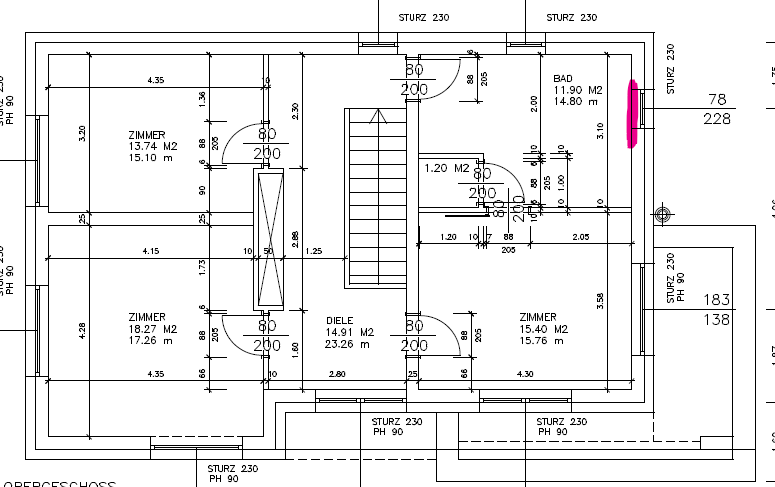 So sieht unser OG Grundriss aus und violett hängt das Innenteil. (das fenster ist leider an dem Plan noch falsch und ist viel weiter Richtung Kamin)