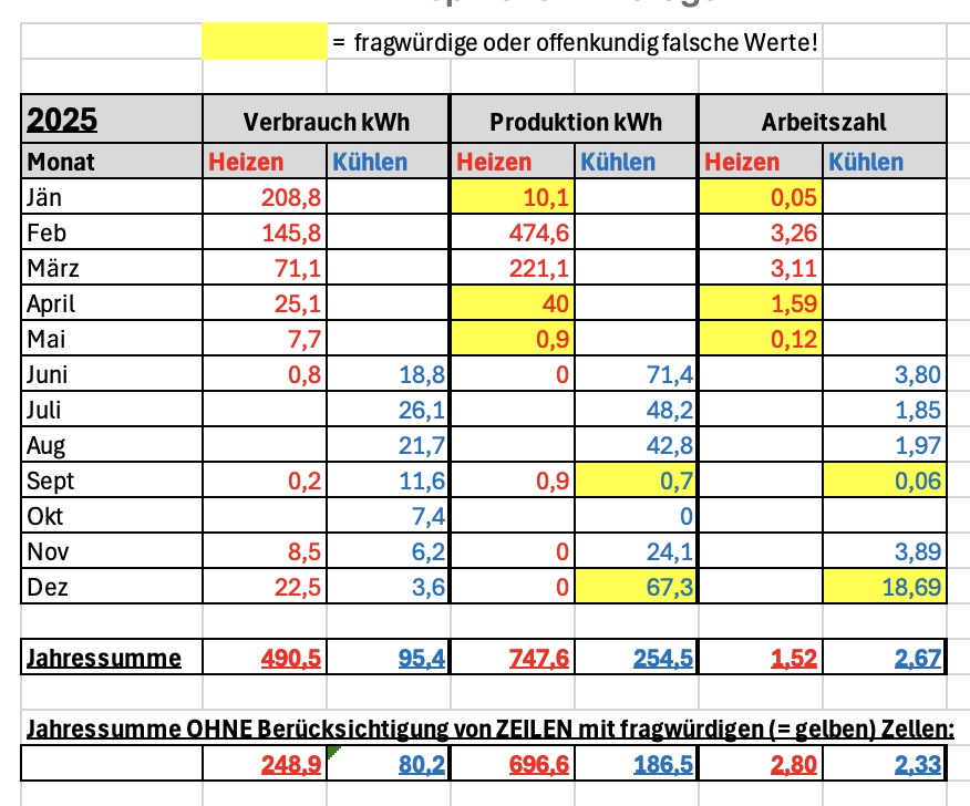 Wenn ich alle Zeilen mit auffälligen Zellen weglasse, ergibt das Arbeitszahlen von 2,80 fürs Heizen und 2,33 fürs Kühlen. Fürs Heizen wäre das schon halbwegs okay, fürs Kühlen finde ich die weitere Verschlechterung eigentlich nicht akzeptabel. Man beachte insbesondere die schlechten Arbeitszahlen in den Haupt-Kühl-Monaten Juli und August!
