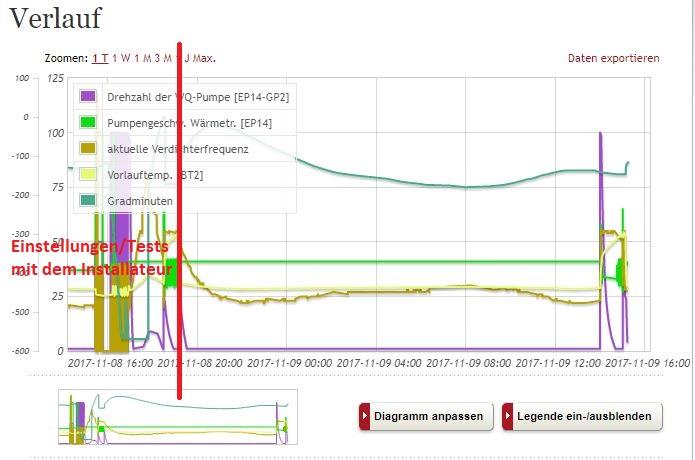 ansonst schaut's super bei dir aus. der verdichter moduliert, sodass vl-ist ~ vl-soll bleibt. die zacken für warmwasser schauen auch sehr gut. nach bedarf wird nachgeladen. |