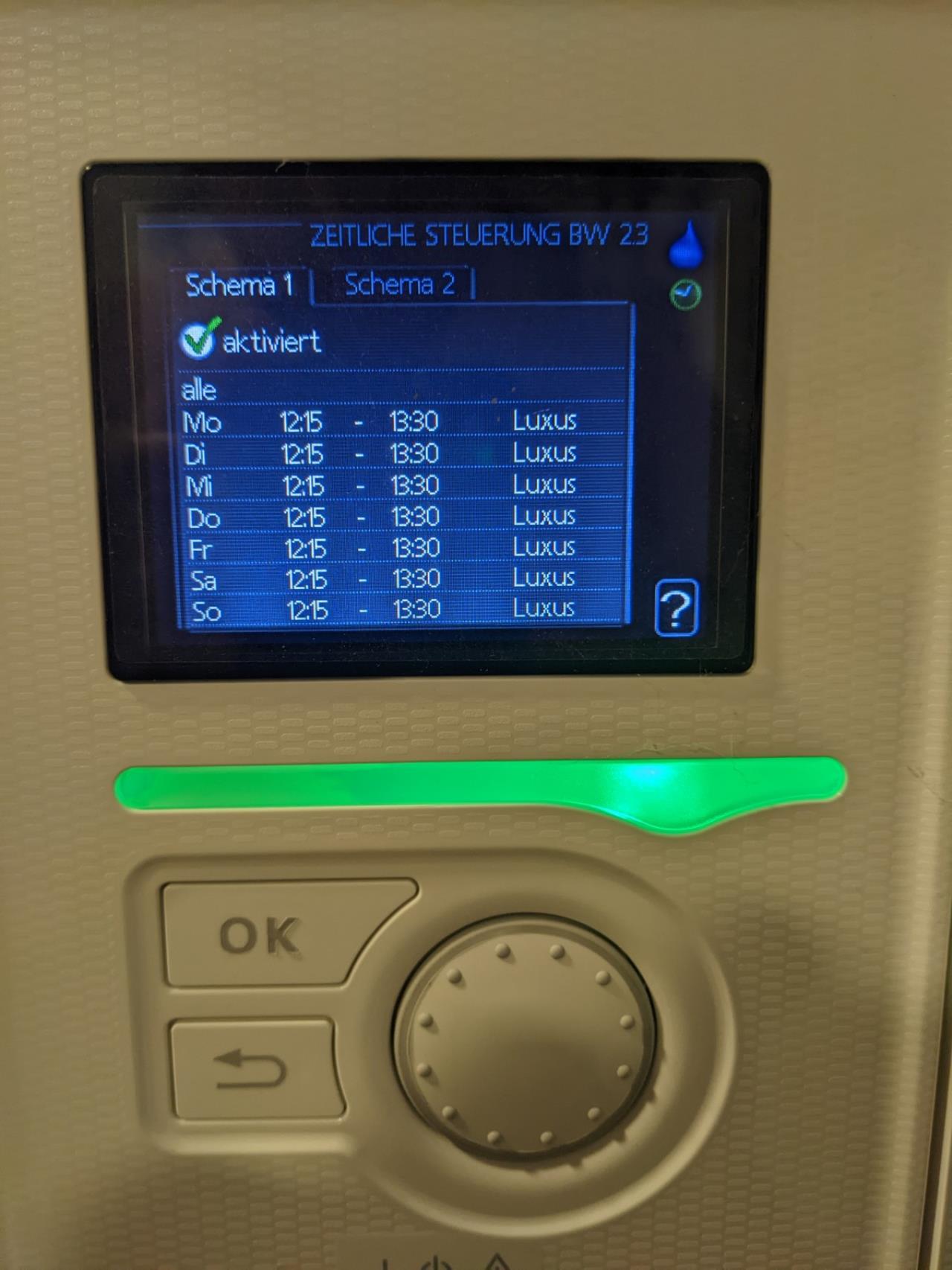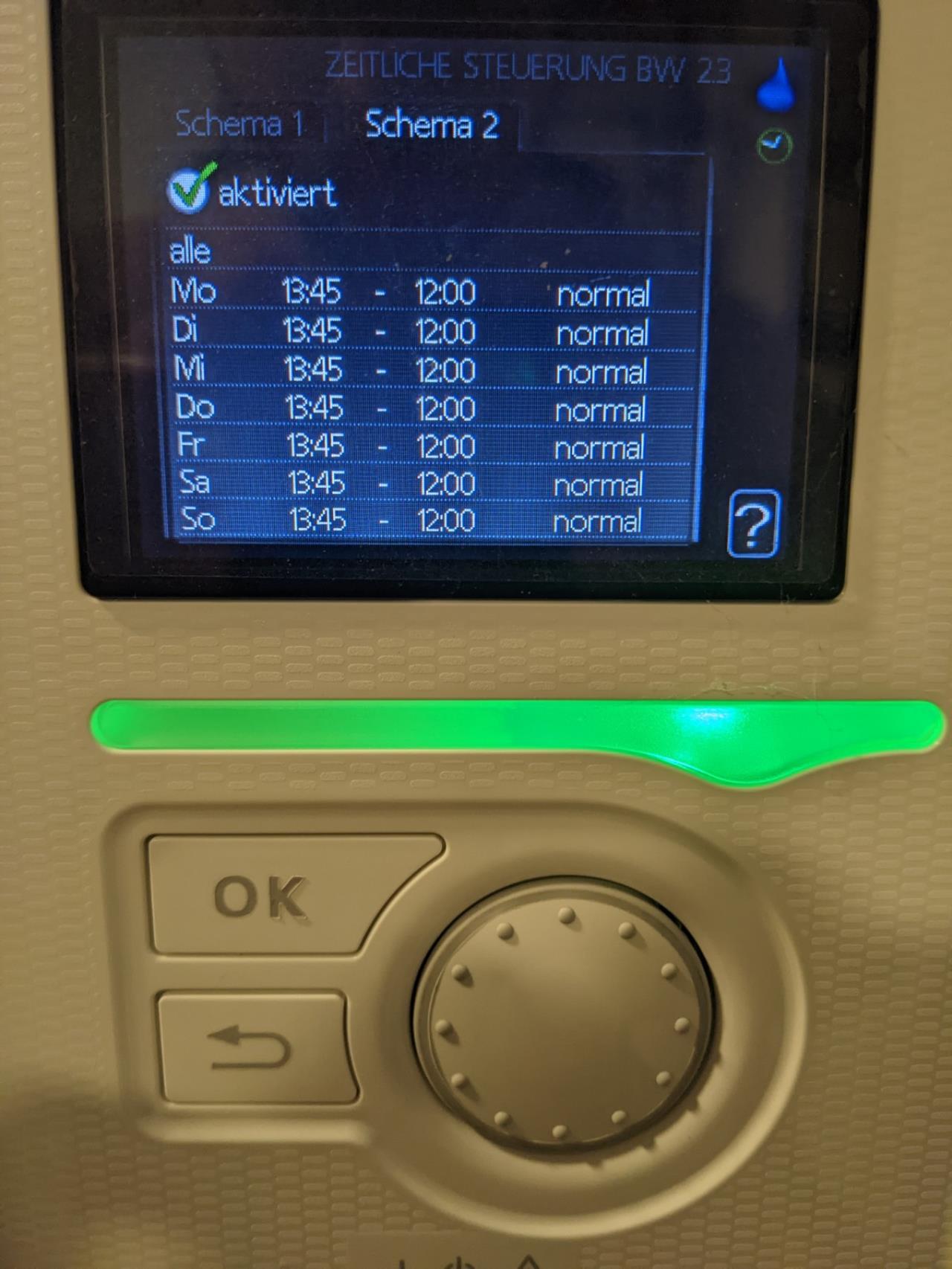 Grüß euch Habe eine Ungereimtheit mit meiner F1155. Das Warmwasser wird immer wesentlich heißer zubereitet als ich eingestellt habe. Ich vermute dass sie die Werte vom "WW oben" Sensor zur Bereitung nimmt. Kann ich das wo umstellen? Aufgrund der Schichtung vom Greenwater beträgt das Delta von "Warmwasser" zu "WW oben" etwa 10°C. Im Sommer habe ich versucht die WW WW [Warmwasser] Bereitung noch etwas zu optimieren, und dafür die Strategie geändert. Mit 33% Volumenstrom wurde noch ohne Fehler bereitet. Seit der Reduktion auf 25% bekomme ich immer den angehängten Fehler. Ich hoffe aber dass ich dies mit einer geringeren Zieltemperatur in den Griff bekomme. Grundsätzlich möchte ich bei PV Überschuss Warmwasser bereiten, und zwar mit etwas Übertemperatur. In den anderen Stunden sollte nur so hoch wie zwingend nötig erwärmt werden und zwar bis meine Freundin mal schreit dass es zu kalt ist. Dies ist aber etwas in die Hose gegangen da Warmwasser mit dem falschen Sensor bereitet wurde und der Aufschrei somit ausblieb. 😬 Hier noch die relevanten Einstellungen: LG Jürgen |
