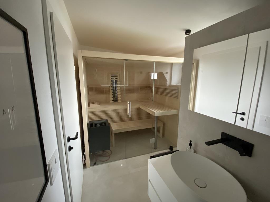 Kurzes Update: Die Sauna haben wir mal aufgebaut, IR-Strahler ist nicht standardmäßig dabei. Nächste Schritte: - Elektroanschluss + Beleuchtung - Innen wird die Rückwand noch mit anderem Holz verkleidet, da müssen wir uns aber noch Muster ansehen - Holzblenden außen werden schwarz verkleidet - Edelstahl-Teile werden schwarz matt beschichtet - Raum zwischen Decke und Sauna-Decke wird mit Rigips o.Ä. verkleidet, muss ich noch überlegen wie wir es am sinnvollsten machen. - Bereich rechts zwischen Sauna und Wand wird mit Fächern/Regalen für Handtücher etc. genutzt |