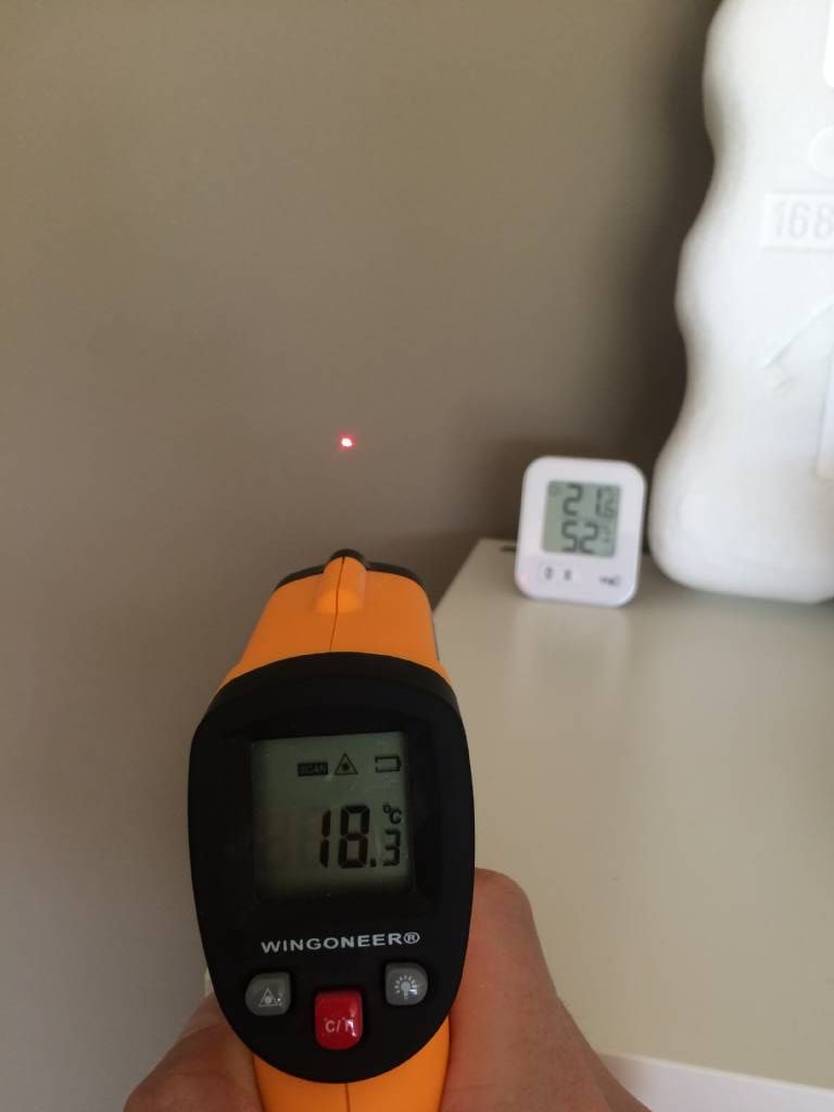 OK, also mein IR-Thermometer geht einigermaßen ungenau, siehe: Also 1,2°C der Messung zu Folge Unterschied zwischen Wandtemperatur und RT RT [Raumtemperatur].
