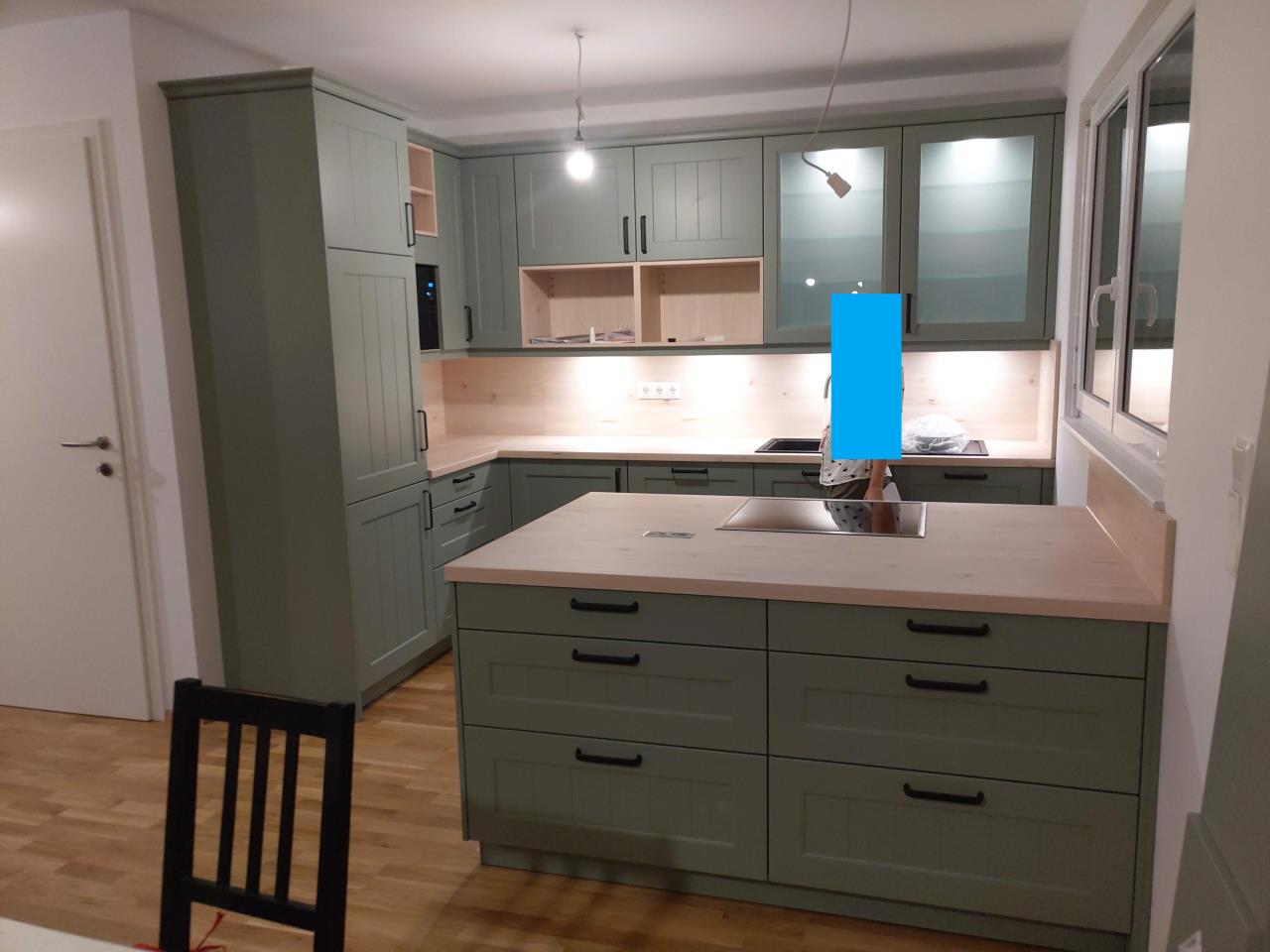 Wir gehen scheinbar komplett gegen den Trend und haben eine Salbei-farbene Küche im Landhausstil. Die Fronten sind matt, Schmutz ist kaum zu sehen. Die Arbeitsflächen sind Spitzahorn, der Parkettboden ist Eiche. Dunstabzug hängt mittlerweile auch an der Decke.