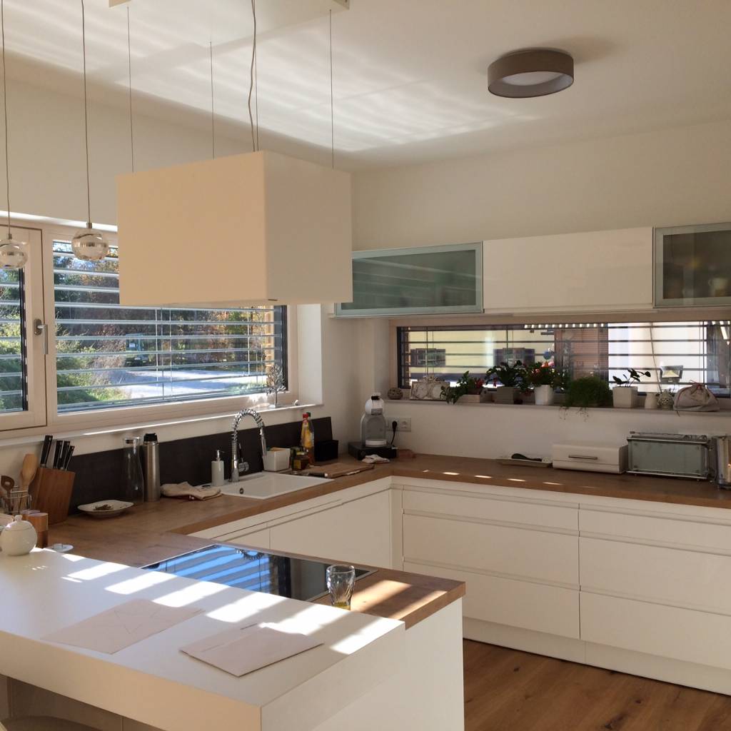 Die Bar wollte mein Mann... Wird zwar nicht als solche genutzt, sondern eher als schnelle Ablage oder für Deko. Als Sichtschutz um vom Essplatz her nicht gleich auf die Töpfe und Pfannen auf der Herdplatte zu sehen ist sie aber perfekt und ich würds heut nicht anders lösen. Grifflose Kästen auf der Inselseite die zum Essplatz zeigt um anzuzeigen, dass hier die Küche zu Ende ist und der Wohnbereich anfängt. Rolloschrank: Ich liebe ihn! Da wir keine Speis haben sind hier unsichtbar das Kaffeegeschirr, Toaster, Eierkocher, Milchschäumer, etc. verstaut. Edelstahlspüle: Zerkratzt man sehr schnell. Die ersten Kratzer tun weh, mittlerweile ists mir aber egal und ich sag mir, es ist halt ein Gebrauchsgegenstand. Oberschränke wollten wir auf keinen Fall aus Glas. Hier sieht man sonst das "Gramuri" immer durch - auch wenns satiniert ist... Höhergestellter Geschirrspüler: Die beste Idee überhaupt. Aus Platzmangel ging sich leider der Backofen nicht mehr höhergestellt aus und dieser ist somit in der Insel ganz klassisch unter dem Kochfeld. Wir haben dafür lieber den Geschirrspüler hochgestellt, weil wir diesen täglich öfter benutzen als den Backofen. Hat sich eindeutig als beste Lösung gezeigt. Mikrowelle: ja wir haben noch eine.... ist ab und zu wirklich praktisch. Apothekerschrank und viele Vorratsschränke: Da wir keine Speis haben müssen wir die Vorräte in der Küche unterbringen. Den Apothekerschrank möchte ich nicht mehr missen - ein geniales Teil! Ursprünglich war eine U-förmige Küche geplant und dort wo die Terrassentür ist nur ein Fenster. Gott sei Dank, haben wir umgeplant und sparen uns so die teuren Ecklösungen. Auf der Insel haben wir viel Arbeitsfläche. Die Bar sollte ursprünglich bis zur Wand durchgehen. Der Küchenplaner hatte dann aber die Idee sie nur bis ca. zur Hälfte der Insel zu machen. Somit entstand quasi noch eine "Durchreiche". Wenn ich den Esstisch abräume kann ich die Teller etc. bequem über die Insel bringen. Wir wollten damals einen amerikanischen, freistehenden Kühlschrank. Heute würde ich ihn aus optischen Gründen integrieren. Irgendwie schaut er doch immer wie ein "Fremdkörper" aus. Boden: Wir wollten in der Küche unbedingt Fliesen, aber trotzdem eine "warme" Optik. Ich denke, das ist uns sehr gut gelungen und meinen Fliesenboden würde ich immerwieder machen - sehr pflegeleicht! LG BK |