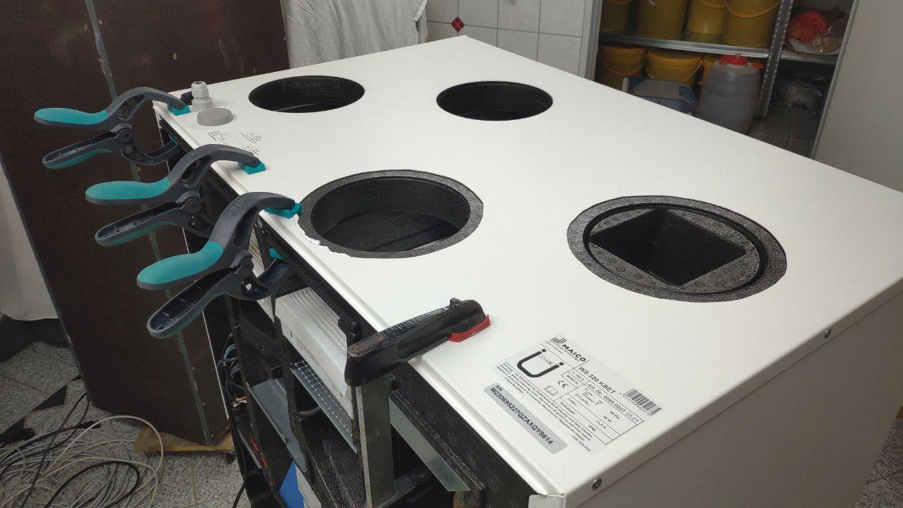 Die Styropordicke ist sehr unterschiedlich, aber wohl immer gut 3cm. Der Deckel war mit 12 Nieten befestigt, die habe ich aufgebohrt und dann von der Innenseite mit der Stichsäge geschnitten, ziemlich frei Schnauze, weil man das dann mit der Rohrdämmung eh nicht mehr sieht. Am vorderen Rand ist der Deckel verklebt, die Kleberaupe war aber nicht sehr fest. Ich habe das wieder so gemacht, weil ja vorne das Blech nicht gehalten wird. Das Blech ist pulverbeschichtet, Metallstärke 0.7mm würde ich schätzen und recht weich, problemlos schneidbar.