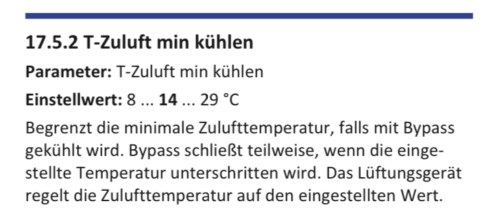 Doch ich denke der Bypass nimmt auch Zwischenpositionen ein. Deine Zuluft bewegt sich nahe den 14C was die Default zulässige minimale Grenze dafür ist. Siehe Manual Edit: Beim zweiten Bild hattest du höhere Temperaturen und deswegen einfach nur Bypass voll auf ohne Regelung