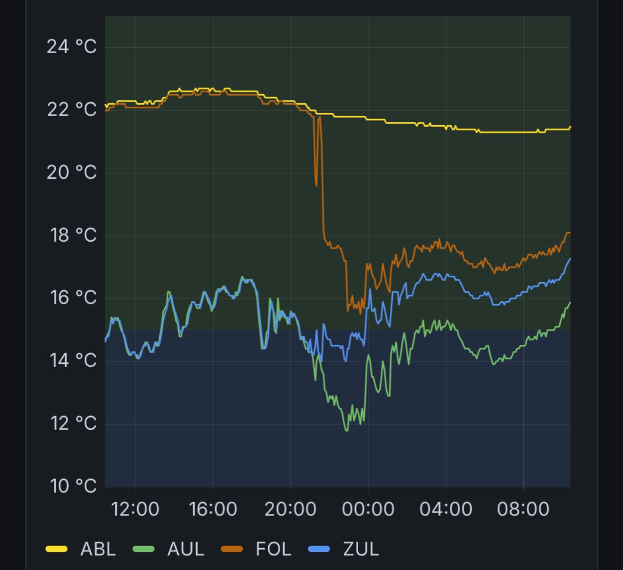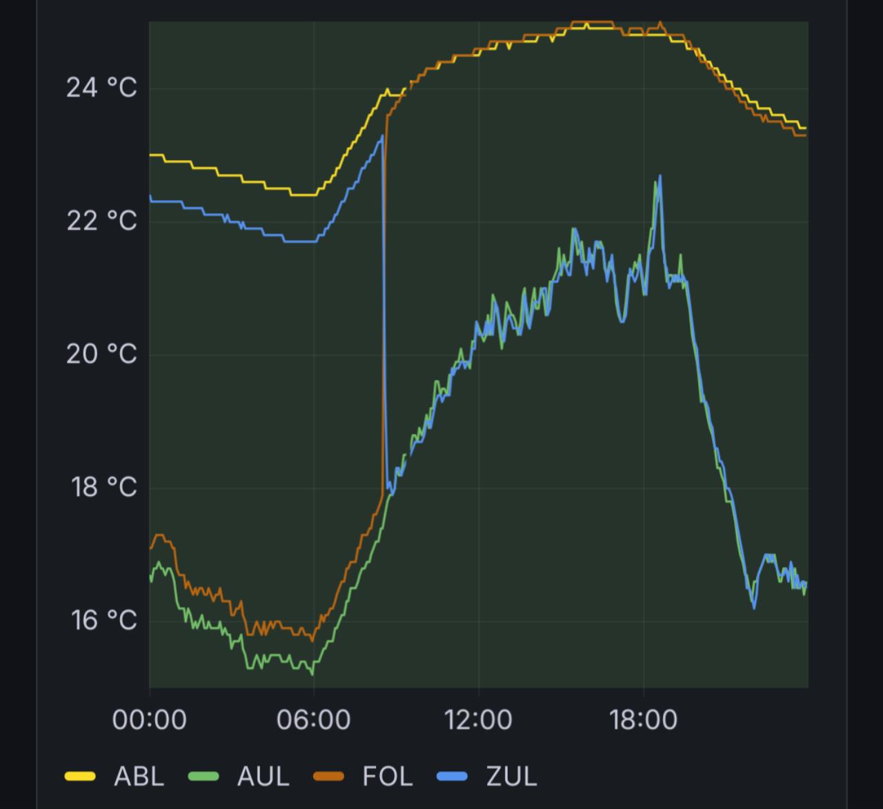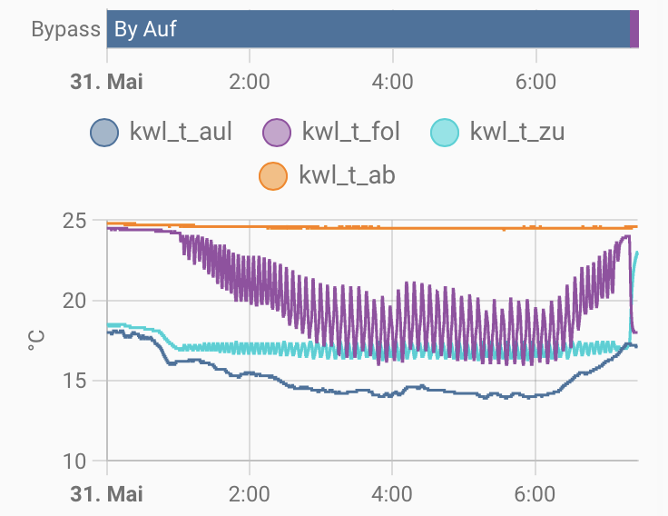 Ich habe gerade vielleicht ein ähnliches Thema und hänge mich hier mal an. Gestern Abend hat sich bei meinen Temperaturen was geändert, was ich mir nicht wirklich erklären kann. Es schaut so aus, als wäre der Bypass halb offen, aber das kann ja nicht sein, oder? Das Gerät sagt über Modbus, dass er offen ist. Edit: So hats vor ein paar Tagen ausgeschaut, als der Bypass geöffnet hat: |