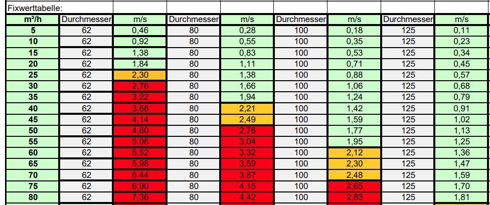 zu obiger Tabelle von komfortlüftung.at: die ist leider irreführend, weil die zulässige Strömungsgeschwindigkeit mit kleiner werdendem Durchmesser stark abnimmt. Bei kleineren Rohrquerschnitten ist die Randströmung nämlich dominierend. Eine "freie" Kernströmung mit geringer Reibung gibt es nur bei entsprechendem Abstand zur Rohrwand, also bei größeren Durchmessern. Auch die Übergänge vom Rohr auf den Durchlass sind sehr wichtig. Es gibt z. B. Übergangsstücke aus Kunststoff mit Anschlüssen für 2 x 75 mit ovalem Übergang auf das "Knie" für ein DN125 Ventil. Das Ovalstück ist so eng, dass es Geräusche ab 30m³/h verursacht. Eine weitere Quelle für Strömungsgeräusche ist die Einströmung vom Verteiler in die Rohre. Da ist ein scharfkantiger Übergang. Die Dämpfung der Rohre allein (egal ob Flexschlauch oder Wickelfalz) ist nicht ausreichend, um diese Geräusche zu eliminieren. |