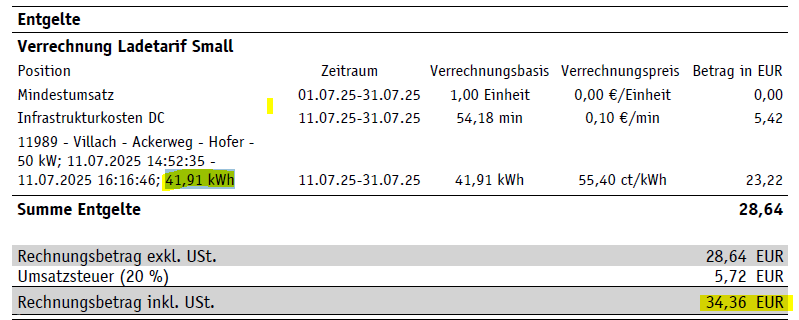 preise sind teilweise noch immer echte abzocke beim firmenauto mit der energie steiermark karte (small-tarif) weil gelegentliches laden beim hoferparkplatz in villach für die rd 42kwh doch fast € 35,-- bezahlt das sind inkl. mwst über 0,80€ pro kwh bin fast 90' dort angestöpselt gestanden, weil bei einem termin |