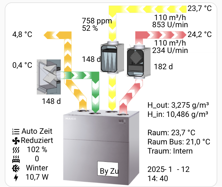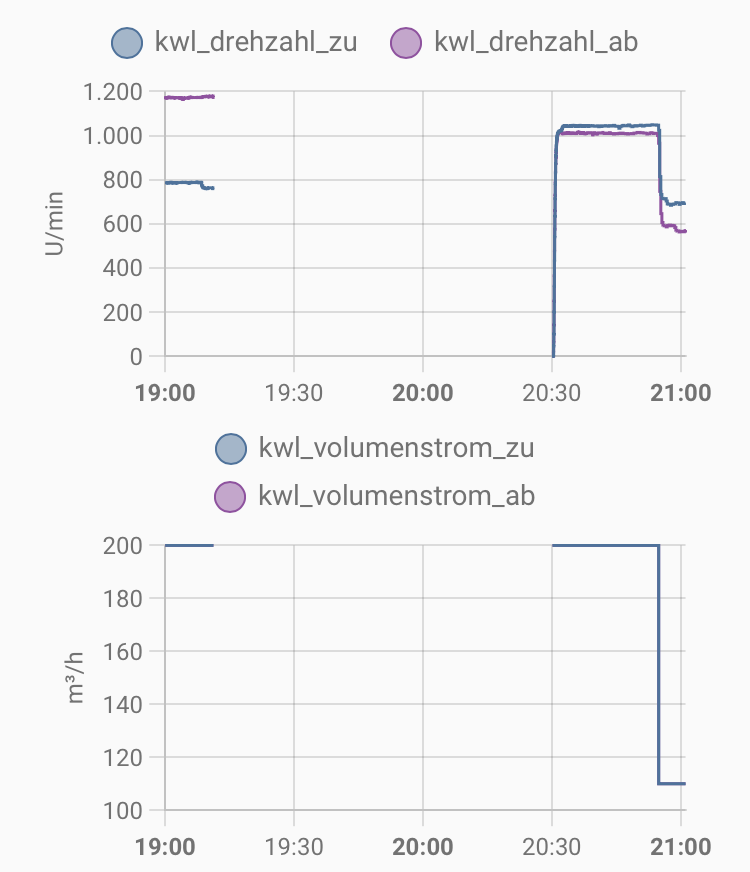 Es müsste sich um Ventilatoren mit intern geregeltem Konstantvolumenstrom handeln. Warum das Tachosignal jetzt falsch ausgelesen wird? Den Fehler kann ich mir nicht erklären. Bei 234rpm müsste der Lüfter ja ganz langsam laufen und es müsste ein Unterdruck im Haus entstehen je nach Gebäudedichtheitswert. |