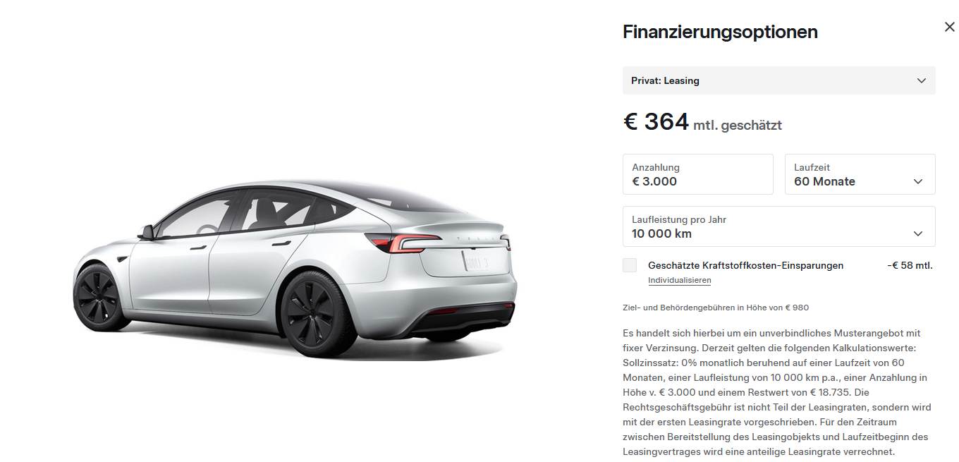 Naja Tesla Model 3 LR RWD mit 0€ Anzahlung (die 3000€ sind E-Bonus) bekommst mit 0% Finanzierung um 364€ / Monat, Service brauchst nicht machen, 4 Jahre Garantie auf alles, Mit Vollkasko sind es dann ca.500€, da brauche ich wegen einen ABo nicht überlegen...