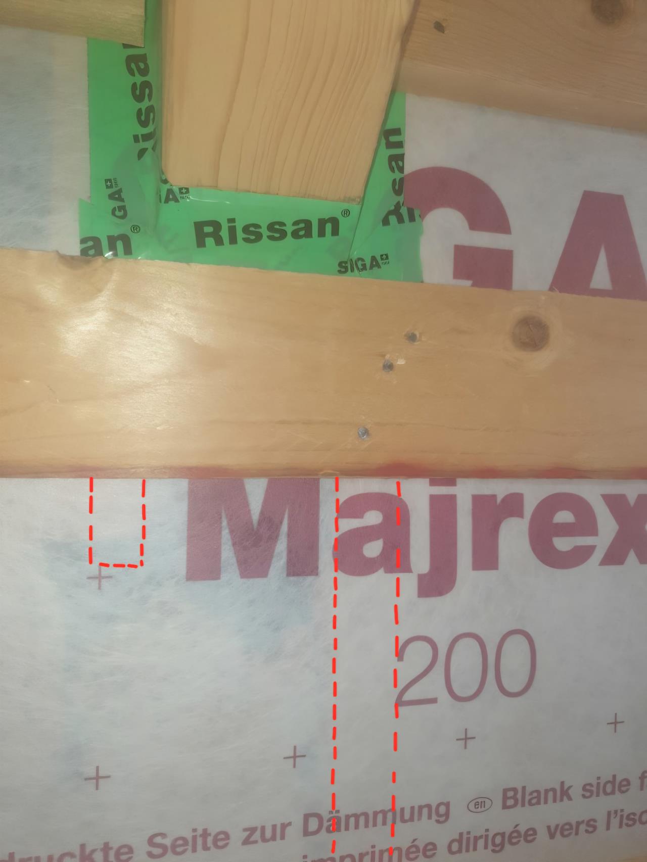 Ich hab die Konstruktion nochmals erfühlt, um das Problem irgendwie rausfinden zu können. Ich glaube dass es an dem überstehenden Hilfssparren liegt, der unter den kehlbalken einen "Dämmschatten" bildet. Ich nehme an, dass man den Hilfssparren (Ich weiß nicht ob das der richtige Begriff ist) links vom Kehlbalken bündig abschneiden hätte können. Außerdem hätte man das beim Einblasen vermutlich auch noch leicht abfangen können wenn man diese Stellen gesondert mit der Lanze berücksichtigt hätte. |