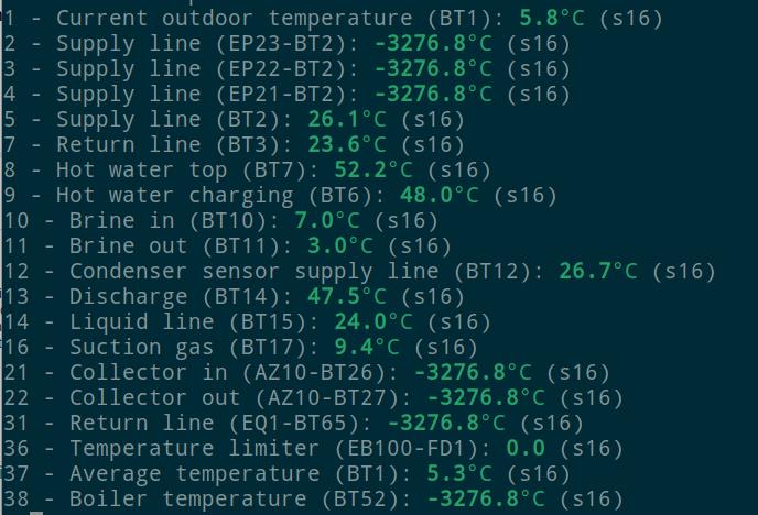 Auswertung der Daten Neben den Klassikern wie regelmäßiges Pollen der Daten und Weiterleitung dieser in z.B. eine InfluxDB oder Anbindung der WP WP [Wärmepumpe] über Home Assistant via REST statt Modbus wäre natürlich auch ein teilweiser Nachbau des WP WP [Wärmepumpe] Menüs als Webapplikation vorstellbar. Da offenbar jetzt auch wirklich alle abrufbaren Daten mit einem Request abholbar sind, geht da bestimmt einiges. Zudem gibt es ja abgesehen von den getPoint/getPoints API Calls auch noch getNotifications, was sicherlich für Leute interessant ist, die Ihre WP WP [Wärmepumpe] nicht an myUplink haben, aber dennoch regelmäßig nach Alerts schauen wollen. Bei mir ist der Output dieser methode zwar bisher zum Glück immer leer, aber falls eine WP WP [Wärmepumpe] in unregelmäßigen Abständen Fehler wirft, kann man damit schauen wann die entstehen, da auch den Verlauf protokollieren und je nachdem auch gleich löschen. Ich hab bisher erstmal nur etwas mit Ruby rumgespielt um mir einen Überblick über die vorhandenen Daten zu verschaffen und deren Schlüssigkeit zu prüfen: require 'json' require 'colorize' filename = "/tmp/newpoints1" def printcurrent(point) title = point['title'].to_s md = point['metadata'] registerid = md['modbusRegisterID'] unit = md['unit'] divisor = md['divisor'] value = point['value']['integerValue'] modbusregister = md['modbusRegisterID'] puts "#{modbusregister} - #{title}: #{(value.to_f/divisor).to_s.green.bold}#{unit.green} (#{md['variableSize']})" end jsondata = JSON.parse(File.read(filename)) jsondata.each{|k,v| printcurrent v} Der Output (gekürzt auf 20 Zeilen) sieht dann in etwa so aus: Falls Bedarf ist, kann ich auch den ganzen Output mal als Anhang hochladen. |