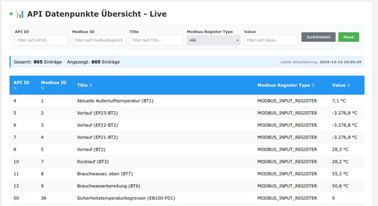 Hallo, ich finde das Thema REST API spannend und habe ein PHP Script erstellt. Die Daten können abgerufen und gefiltert werden. Punkte die schreibar sind haben ein Bearbeiten Symbol. Die Anzeige akualisiert sich alle 10 Sekunden. Das ist beim Ändern der Daten noch etwas unglücklich hat aber bei meinen Tests soweit ganz gut funktioniert. Ich habe das Projekt bei Github eingestellt. https://github.com/SvenPausH/NibeAPI/blob/main/README.md |