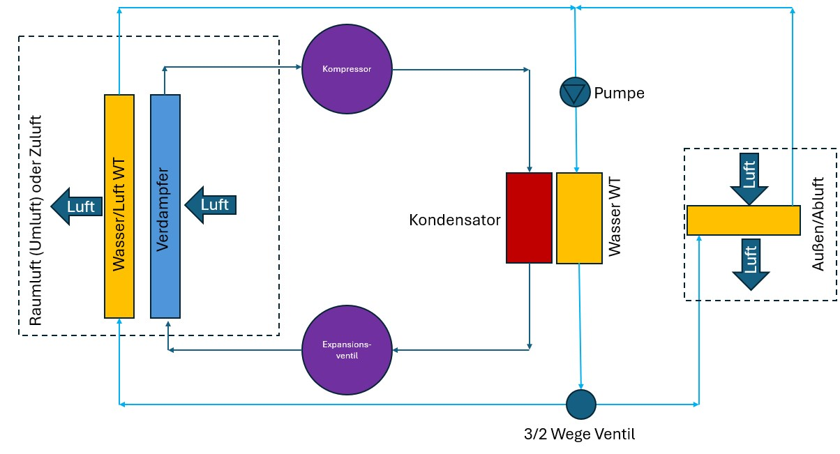 gute Überlegungen. Solche Lösungen mit 2 bis 3x Kondensator (in Zuluft nach Verdampfer, in der Fortluft und extra als Wasser-Plattenwärmetauscher) gibt es teilweise. Aber nur in kompletten Lüftungsgeräten. als Nachrüstung ist sowas schwer möglich umzusetzen. Besonders die Fortluft einzubeziehen ist Nachrüst-technisch eher nur Wunschgedanke, denn eine echte Umsetzungsmöglichkeit. Sole muss nicht sein. Wasser aus dem Heiz/Kühlkreis zu verwenden wäre ja eigentlich der Standard. Sole bietet sich nur an, wenn vorhanden. |