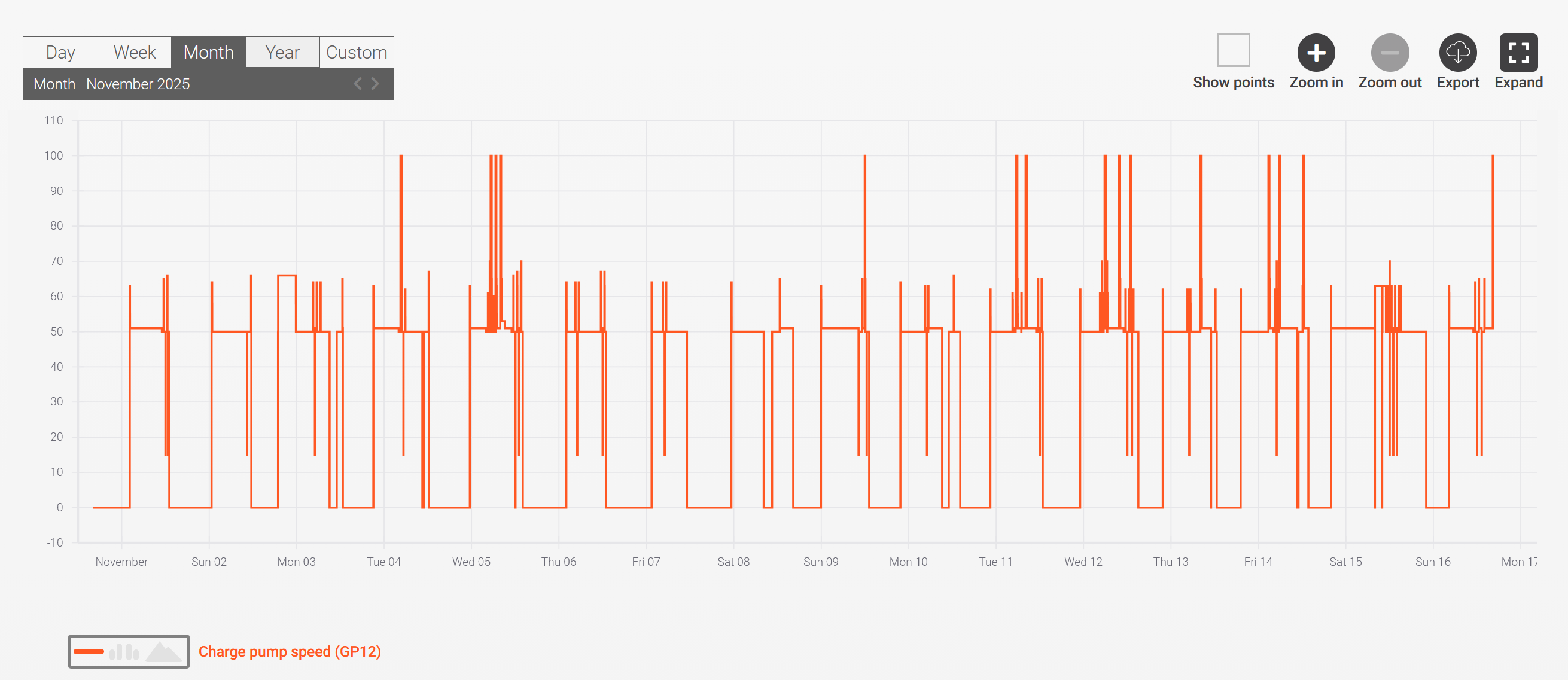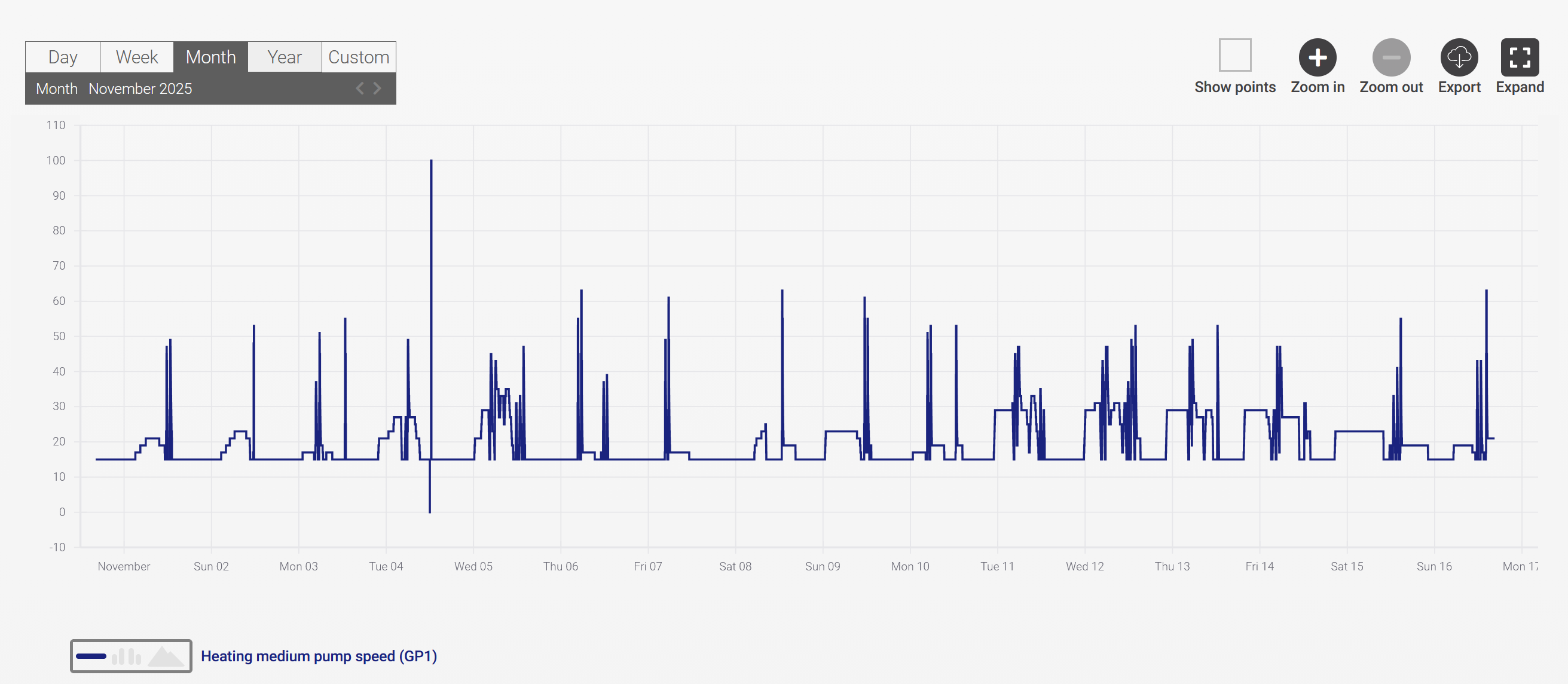 Zieh das Zeitfenster mal kleiner, dass man einen Lauf sieht, aus dem ganzen Tag kannst schlecht genau raus lesen. Die Spikes würden halt unten zur WW WW [Warmwasser] Bereitung passen. Leg da bitte VL VL [Vorlauf] und Anforderung mit drauf dann siehst es |