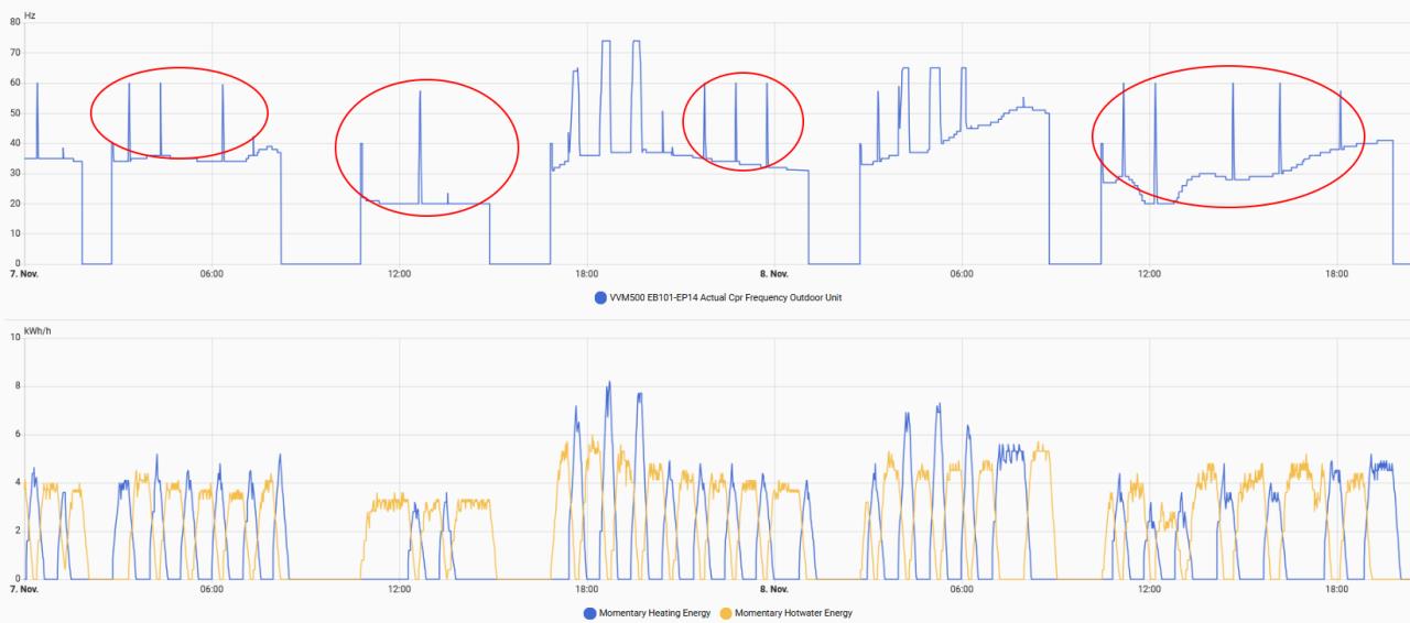 Ich weiß leider nicht was State-of-the-Art ist hinsichtlich Art und Anzahl der Pumpen & Mischer. Sonst hätte ich mir das ganze ja komplett selber dimensionieren können. Ich finde es aber ganz nett EG und OG separat mischen zu können, da die Geschosse nicht gleich sind. Auch wenn ich es nicht tue bisher. Die Pumpen laufen derzeit auf < 50%. Einen Verlauf habe ich dazu aber nicht. Und weil ich hier @robfox 's Grafik mit den vielen Spikes sehe, weiß zufällig jemand wie die Spikes in der Verdichterfrequenz zustande kommen? "Aufwärmen"? (Sorry für den Themenwechsel.) |