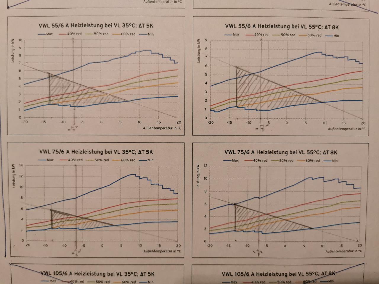 Hallo! Die Daikin haben wir gedanklich inzwischen ausgeschieden. Auch wenn sie von der Heizleistung ausreicht: Das Bauchgefühl (Kombination aus vorgeschlagene Lösung und Installateur) passt einfach nicht. Dafür sind wir auch der Ansicht, dass die 5kW Modelle von Stiebel Eltron oder Vaillant reichen müssen. Nur: Ich habe mir wirklich Mühe gegeben, aber ich bin unsicher, ob ich verstehe, wo ich im Diagramm genau die Gebäudelinie einzeichnen soll. Vielleicht könnt ihr mir noch einmal dazu helfen, das wäre toll. Das sind die Leistungsdiagramme für die 5kW und 7kW Varianten der beiden Geräte: Der 7°C Bivalenzpunkt ist mit Bleistift eingezeichnet. Da wir mit das Gasheizung im letzten Jahr mit 44° Vorlauftemperatur gefahren sind, orientieren wir uns an der roten Linie W45 bei Stiebel ELtron) bzw. einem gedachten Mittel zwischen den W35 und W55 Kurven von Vaillant. Und jetzt die Gebäudelinie: