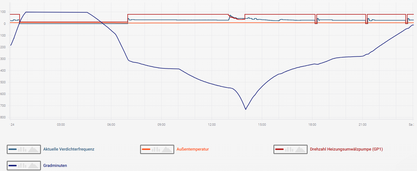 Gradminuten Ist zwar die Sole-WP 1256-8, aber die Grundeinstellung der Gradminuten ist dort ebenfalls bei -60. Um Tagesspitzen der AT AT [Außentemperatur] zu durchtauchen, habe ich in der Übergangszeit die auf -200 abgesenkt und -400 Startdifferenz Zusatzheizung für die Modulationsgeschichte eingestellt. Jetzt für den winterlichen Dauerbetrieb habe ich zu Übersichtlichkeit der graphischen Darstellung von GM und anderen Parameter zusammen, den Verdichterstart in mehreren Schritten wieder auf die -60 angehoben - und sehe im Dauerbetrieb ein ebenso dauerhaftes Herummodulieren um 80 Gradminuten unter dem Startwert. Also derzeit eingestellte -60 GM, die dynamisch immer um -140 GM liegen. |