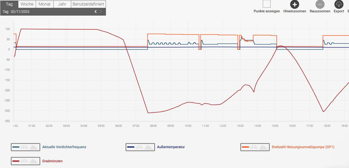 Die Temperaturen liegen zwischen 21 - 22 °C. Alle ERR ERR [Einzelraumregelung] sind offen, die Räume sind über die Tacosetter eingestellt.     Das Bild ist von letzter Woche. Hier nochmal von heute:      Das die GM irgendwann auf 0 gehen gegen nachmittag ist ok, weil kein Heizbedarf mehr. Mein Problem sind die Stopps um kurz vor elf und kurz vor eins. Alleine für diesen Zeitbereich habe ich nun 3 Starts, wo früher nur einer war. Ich weiß nicht was ein Schnüffelmodus ist, aber die HU Pumpe läuft ohne Heizbedarf bei 15 %, das entspricht knapp 6 l/min, bei Heizbedarf (mittlerweile) im Automodus mit max 85 %, das sind dann ca. 21 l/min und wenn der Stopp kommt und sie im Status "Warten" steht ist sie aus. Der Automodus hat sich übrigens heute für eine Drehzahl von 68 % / 17 l/min entschieden.  |
