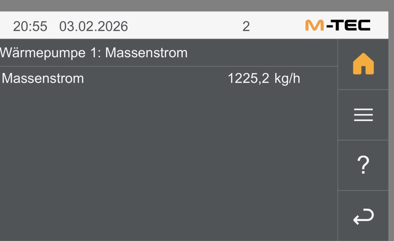 Aktuell läuft die WP WP [Wärmepumpe] seit gestern 14:20 Uhr ununterbrochen im Dauerbetrieb. Massenstrom bei 1231 kg/h. |