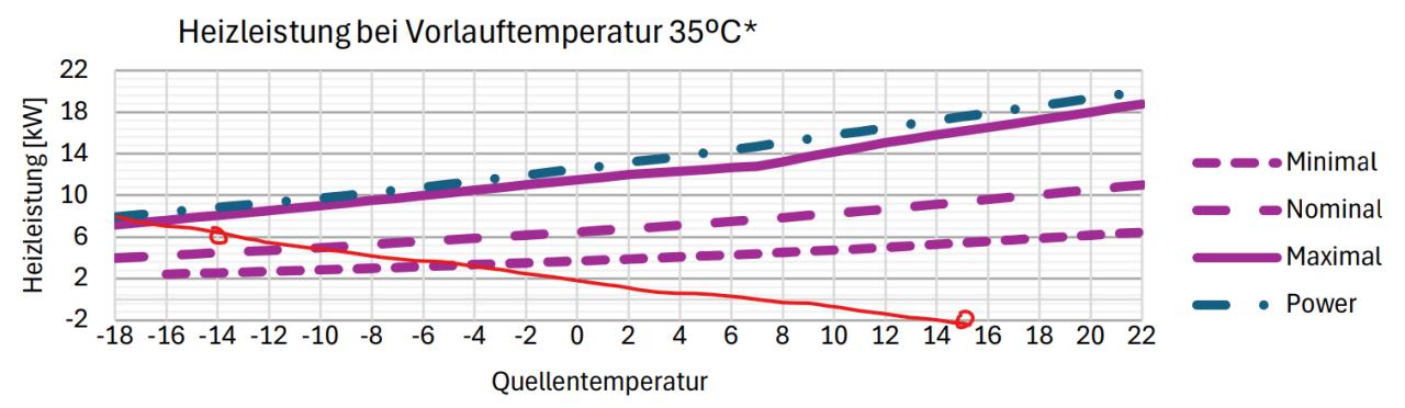 Das sind ja hervorragende Nachrichten. Ja, die Minimaldrehzahl der UWP würde ich noch auf 45% reduzieren. Du solltest auch noch testen, ob ihr mit einer Maximalen Kompressordrehzahl von 50% auch gut über die Runden kommt, dann dauert das Aufheizen ein bissl länger. Also "Max. Limit Heizen = 50%" einstellen. Wenn es euch zu warm wird, dann die Heizkurve etwas senken. Bei den Pufferparametern würde ich die Hysterese noch erhöhen. Teste mal mit 6K, 7K oder 8K. Damit bleibt die WP WP [Wärmepumpe] dann bei einer Taktabschaltung länger ausgeschaltet. Das musst du selber rausfinden, was hier gut fürs Haus passt. Ideal wäre, wenn man den Pufferfühler bzgl. Höhe noch etwas weiter runterbringen würde. Mittig wie er jetzt ist, nutzt du regelungstechnisch nur den halben Puffer. Aber dein Puffer scheint lt. Foto weiter unten keine Tauchhülse mehr zu haben? Ich habe bei mir auch die Erfahrung gemacht, dass man den Temperatursensor auch gut mit schwerem Aluminium Klebeband direkt außen auf den Tank kleben kann. Lass dich aber nicht täuschen, sobald es ein paar Grad mehr AT AT [Außentemperatur] hat, wird die WP WP [Wärmepumpe] wieder sehr stark zum Takten beginnen. Leider gibt es im Datenblatt der AHPA413 nur so ein gequetschtes Leistungsdiagramm. Wenn du da deine Gebäudekennlinie einzeichnest, siehst du ab wann die WP WP [Wärmepumpe] zum Takten beginnen würde. Hier nur beispielhaft eine Heizgrenze von +15 Grad angenommen und eine Normaußentemperatur von -14 Grad bei 6kW Heizleistung (hier müsstest deine echten Werte verwenden). Im Beispiel würde man nun sehen, dass die WP WP [Wärmepumpe] erst unter -4°C Außentemperatur in den modulierenden Dauerlauf übergehen kann. Darüber taktet sie immer. Wenn Dein Installateur zumindest so eine einfache Auslegung gemacht hätte, hättest du diese Wärmepumpe sicher nicht bekommen. |