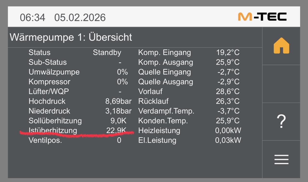 Der Wert der Ist-Überhitzung ist nur im laufenden Betrieb des Kompressors relevant, wenn der Kältemittelkreislauf aktiv ist, das hatte ich vergessen zu erwähnen. Auf deinem Bild ist dieser im Standby. |
