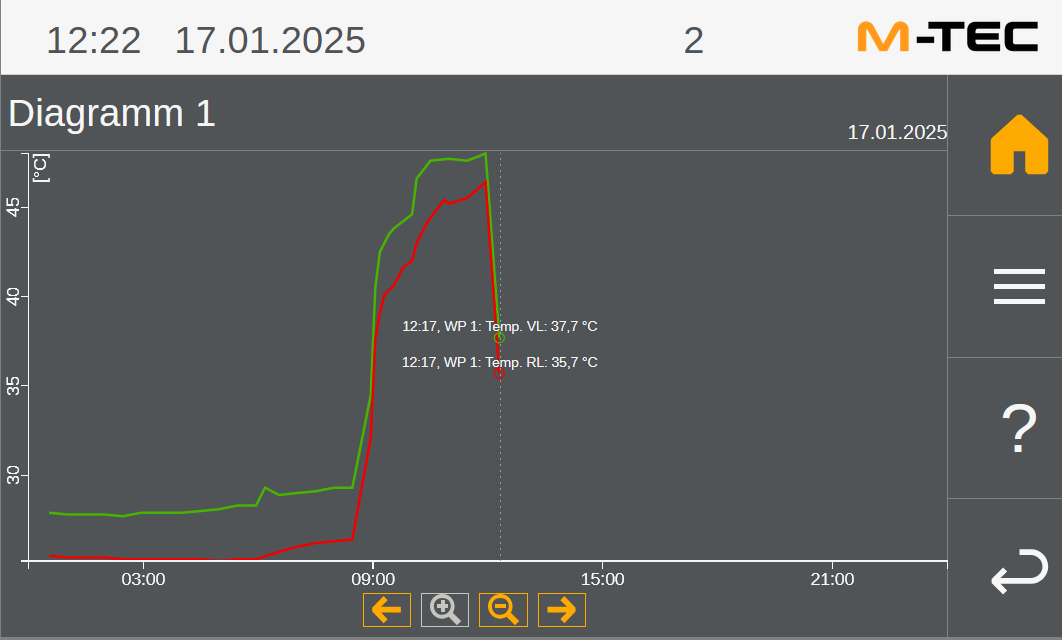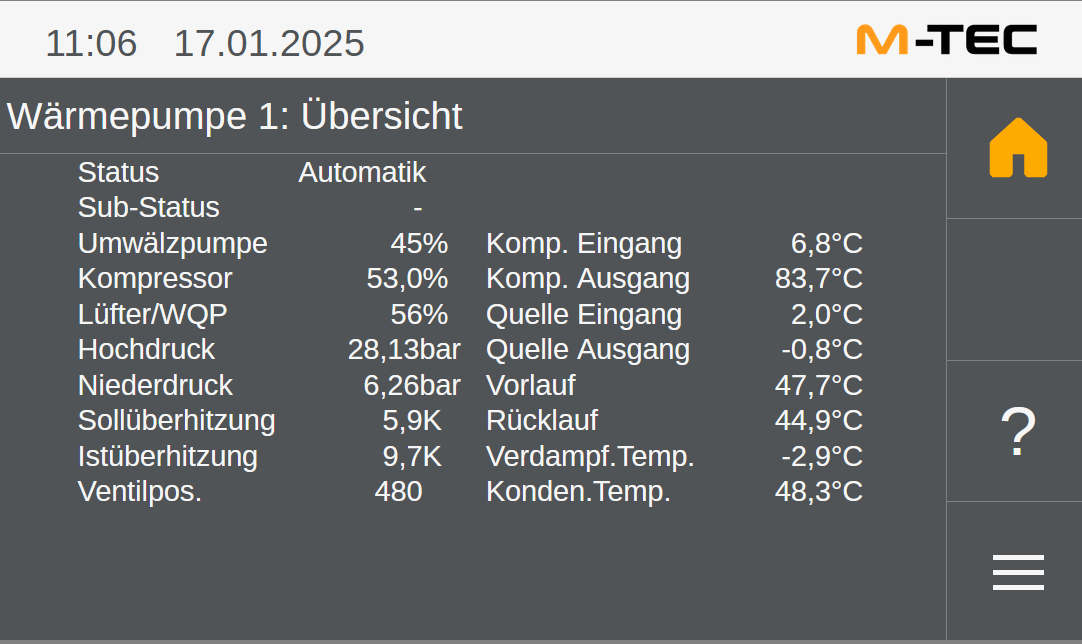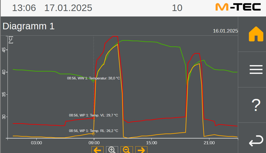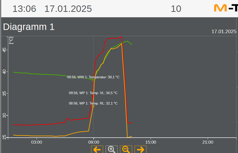 Wieso hat die M-TEC eigentlich eine Nachabsenkung? Was soll das bringen? Jetzt in der Früh muss die WP WP [Wärmepumpe] das aufholen was in der Nacht "verloren" ging und brummt so laut vor sich hin dass man denkt die macht WW WW [Warmwasser]. Hier die aktuellen Werte bei einer AT AT [Außentemperatur] von -3,0°C |