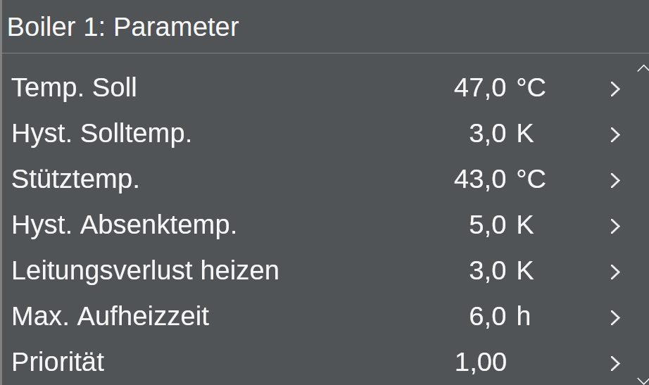 Kann es sein das bei dir die differenz vom Sollwert der Vorlauftemperatur und dem Sollwert der Speichertemperatur zu gering eingestellt ist. Wenn du 47° haben willst sollte der VL VL [Vorlauf] > 50 sein. Vielleicht ist da irgendwo eine Begrenzung für den VL VL [Vorlauf] falsch gesetzt? |