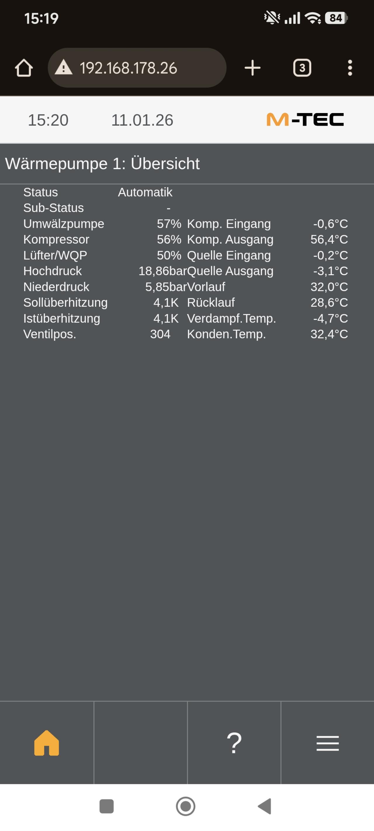 Tiefenbohrung 2x80m Schätze meine Bohrungen sind relativ knapp bemessen, deshalb die sehr niedrigen Sole Temperaturen für eine TB...sobald es wärmer wird, steigen auch die Soletmperaturen wieder. Quelle knapp dimensioniert, dafür die Wärmepumpe umso stärker 🙈😅 Habe ja im Vergleich die große WPS 412 mit 3-11 KW...eigentlich deutlich zu groß ausgelegt. Seit Anfang Oktober habe ich ca. 40 Einschaltvorgänge. Da bin ich eigentlich sehr zufrieden. Stromverbauch Dezember: Durchschnitt 21kwh pro Tag Heizung und Warmwasser. WW wird 1x am Tag auf 52 Grad erhitzt (sind ca. 2,5kwh was die Wärmepumpe dafür verbraucht) Im Haus is es warm genug...ca. 22,5 Grad...Bad 23,5 Grad...virtuelle Raumtemperatur ist auf 20 Grad eingestellt. |