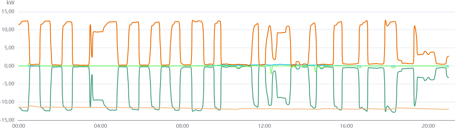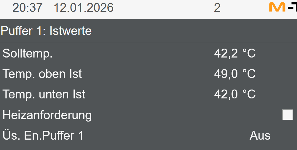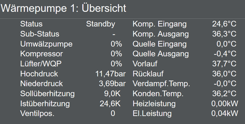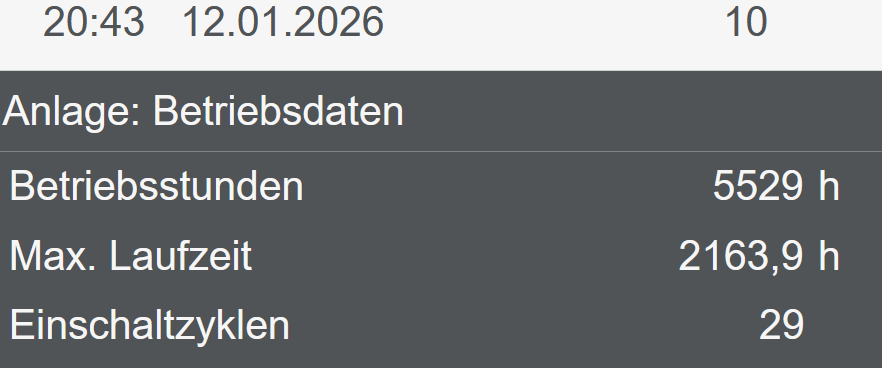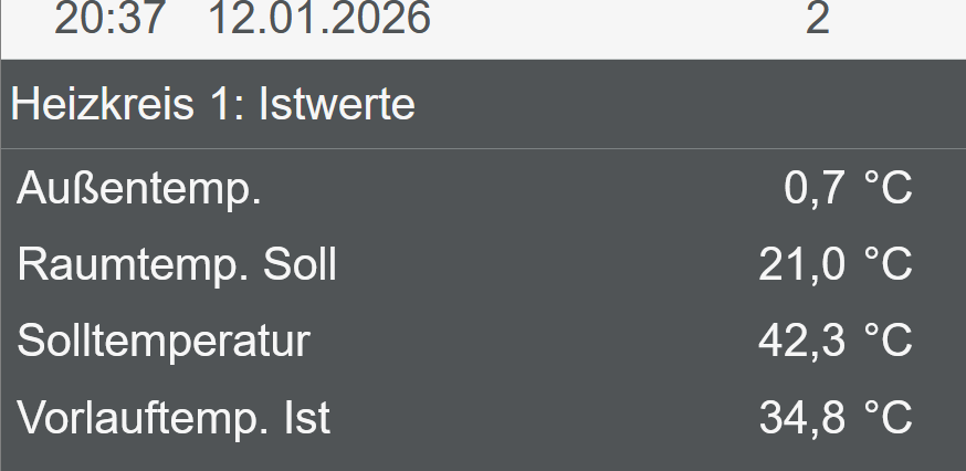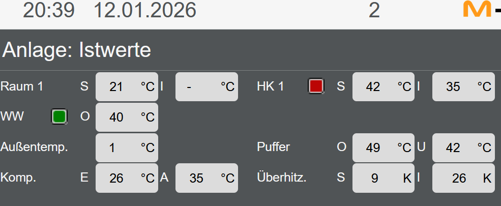 Ich versuche es mal: wo bekomme ich denn: Stromverbrauch / Wärmemenge / COP laut Anzeige der WP WP [Wärmepumpe]? das würde ich als normal bezeichnen, war vor ein paar Tagen (Graf = 1 Tag): WP läuft mit ca. 3kW (leichter Frost) der Peak um 1Uhr morgens ist Donnerstags die Legionellen-Vernichtung gestern gab es einen Ausfall (Druck im Heizungskreislauf war 0, WP vereist. Was zuerst war, weiß ich nicht. Heizung kalt, Support vor Ort per Fernwartung eingegriffen), heute sieht das so aus (draußen ca 0 Grad C) Heizung warm: aber da stimmt doch etwas nicht... (Bauchgefühl) also hier Daten: EFH 1980 mit HK ca 150m² Wohnfläche, mit Keller beheizbarer Raum 220m² - knapp 900m³ Raum -früher Brennwertheizung, Verbrauch 25.000 - 30.000 kWh zu dritt, die letzten Jahre 20.000 - 22.000 kWh - Raumtemperatur gut 21 Grad C - Energiekennzahl (Energieberatung) 116 |