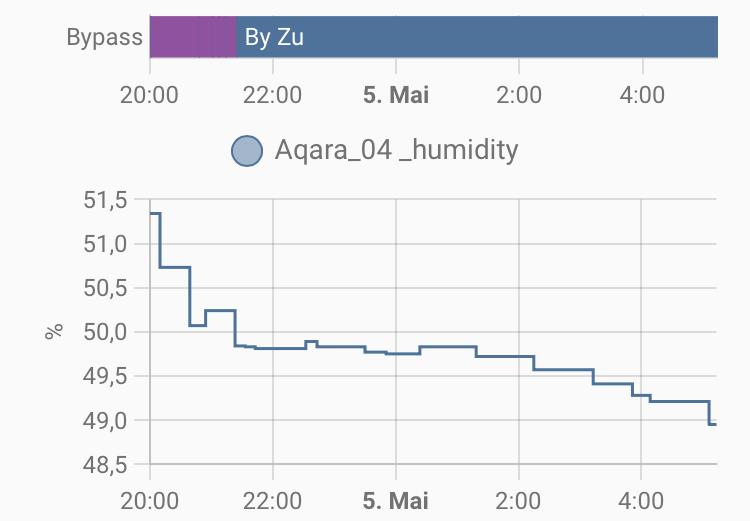 Hmmm also bei 14C hätte ich Bauchschmerzen, dass in einer abgehängten Decke die stehende Luft zwischen kaltem Spirorohr und Trockenbauabhängung am Rohr kondensiert. Ich habe es aber nicht gerechnet. Jedenfalls scheint die Regelung des Bypass zu funktionieren. Ich öffne den Bypass, sobald rF im Führungsraum über 55% steigt und die absolute Feuchtigkeit außen größer ist als innen. Geschlossen wird der Bypass wieder, wenn rF_in < 50% oder H_in < H_out. Letzte Nacht hat das geklappt: Der Entfeuchtungseffekt ist natürlich überschaubar und hängt von der Außenluft ab. Wichtig ist mir vor allem, dass der Bypass nicht mehr aufgeht, wenn die Luft draußen feuchter ist als innen. Sobald das passiert, kriegt man die Feuchtigkeit mit Enthalpiewärmetauscher kaum wieder raus im Sommer. Mal schauen wie lange ich mit der Regelung im Sommer unter 60% bleiben kann. |