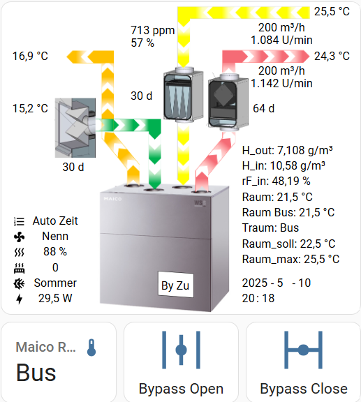 Die Umsetzung Jetzt werde ich etwas schreibfaul und kopiere hoffentlich alles notwendige hier rein. Zunächst ein paar Sensoren definieren: - name: "kwl_t_raum" Noch ein Sensor Template: kwl_traumregelung: Und zwei Template Sensor (ja das ist was anderes als zuvor): - name: "kwl_abs_humidity_indoor" Und eine Input Selection: # input selections Die letzteren Beiden dienen dem Umstellen des Traum Signals auf "Bus". Im Unterordner "custom_templates" liegt bei mir eine Datei "tools.jinja". Darin definiere ich mir Funktionen / Makros: {% macro get_abs_humidity(T_air, h_rel) %} In HomeAssistant habe ich einige Automatiserungen: alias: Update Raumtempauswahl Modbus Register alias: kwl_repeat_Traum_bus alias: kwl_bypass_auto_open alias: kwl_bypass_auto_close Und zwei Skripte: alias: kwl_bypass_open alias: kwl_bypass_close Meine GUI im HA sieht mittlerweile so aus: Ich habe mir zwei Buttons zum Manuellen Öffnen und Schließen des Bypass hinzugefügt. Beim Drücken der Buttons werden die entsprechenden Skripte ausgeführt. Mit der Input Selection links, kann ich das Signal für Traum wechseln. Probiert das gerne mal selber aus. Ich habe bestimmt irgend eine notwendige Information vergessen, aber reiche das gerne nach. Bei mir machen alle Skripte und Automatisierungen nach ersten Tests, was sie sollen. Richtig spannend wird es aber erst im Hochsommer. Ich bin selber gespannt wie sich die Regelung schlagen wird. |