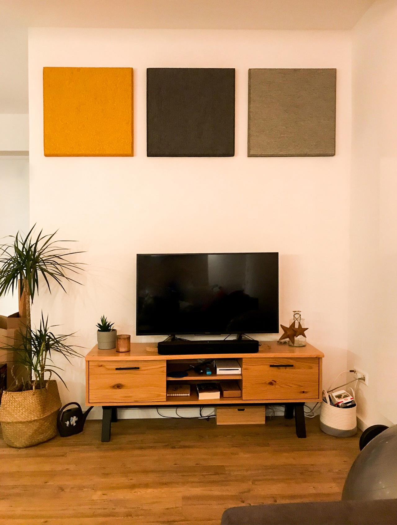 Ich hab direkt nach dem Einzug ein Moos Bild gebastelt. War sehr viel Arbeit, aber es wirkt super gegen Hall. Die Gestaltung ist natürlich Geschmackssache. |