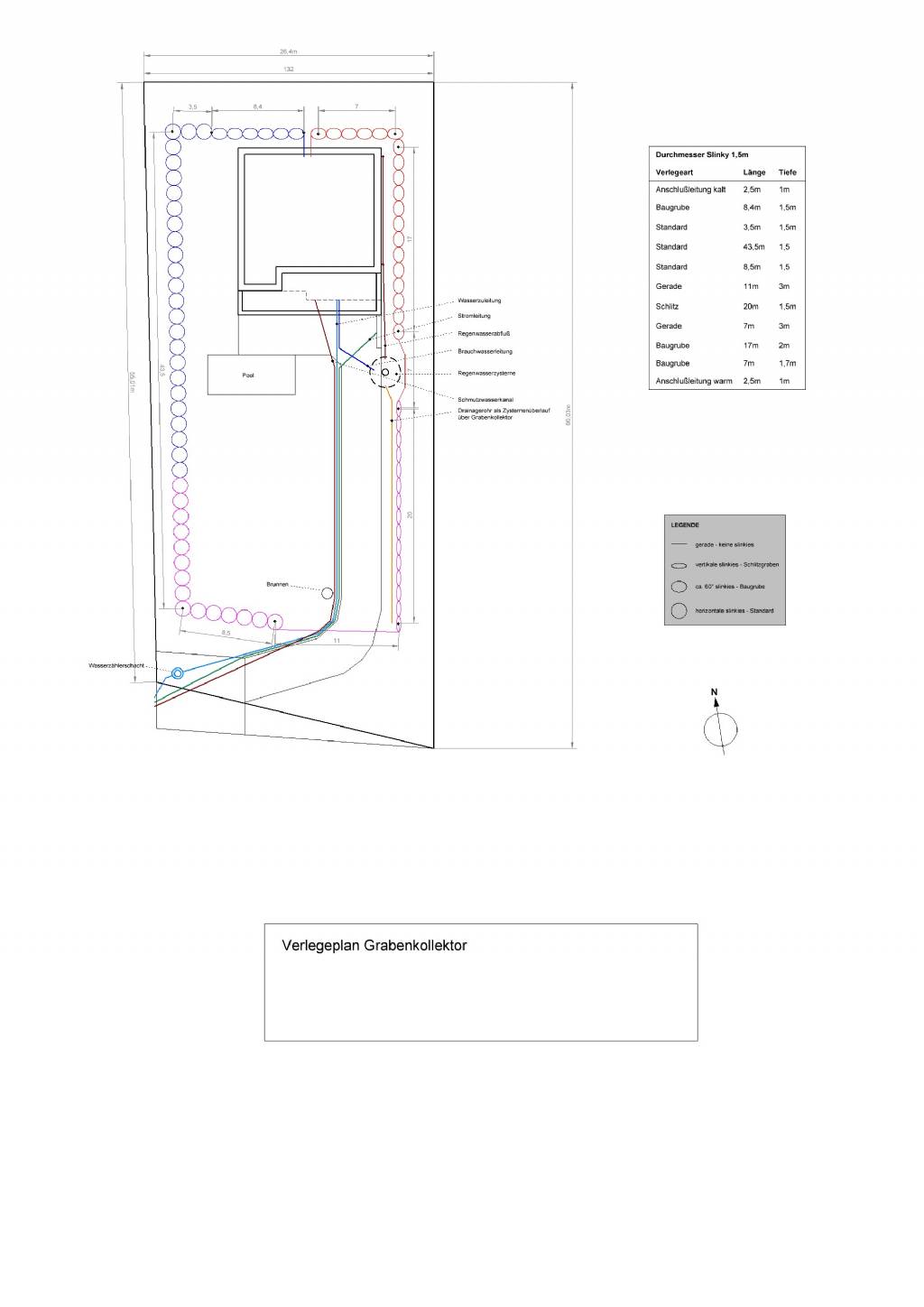 neuer Verlegeplan - Anbei der neue Verlegeplan. Im Prinzip hat sich zum ursprünglichen Plan wenig geändert. Ich muss aber wegen bestehenden Bäumen und Sträuchern und dem Zufahrtsweg im östlichen Bereich den Kolli in einer Schlitzkünette verlegen. Zusätzlich kann ich die Baugrube im Norden und Osten nutzen. WP Ausgang links, Rücklauf über rechts. Feedback erbeten, bevor ich das Grabentool anwerfe um neu zu berechnen.