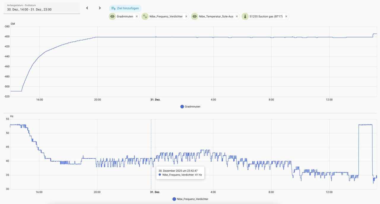 Mitte November: Bei „Drehzahlen“ > 20 Hz zappelte der Verdichter immer um +/- 1 Hz innerhalb weniger Minuten.