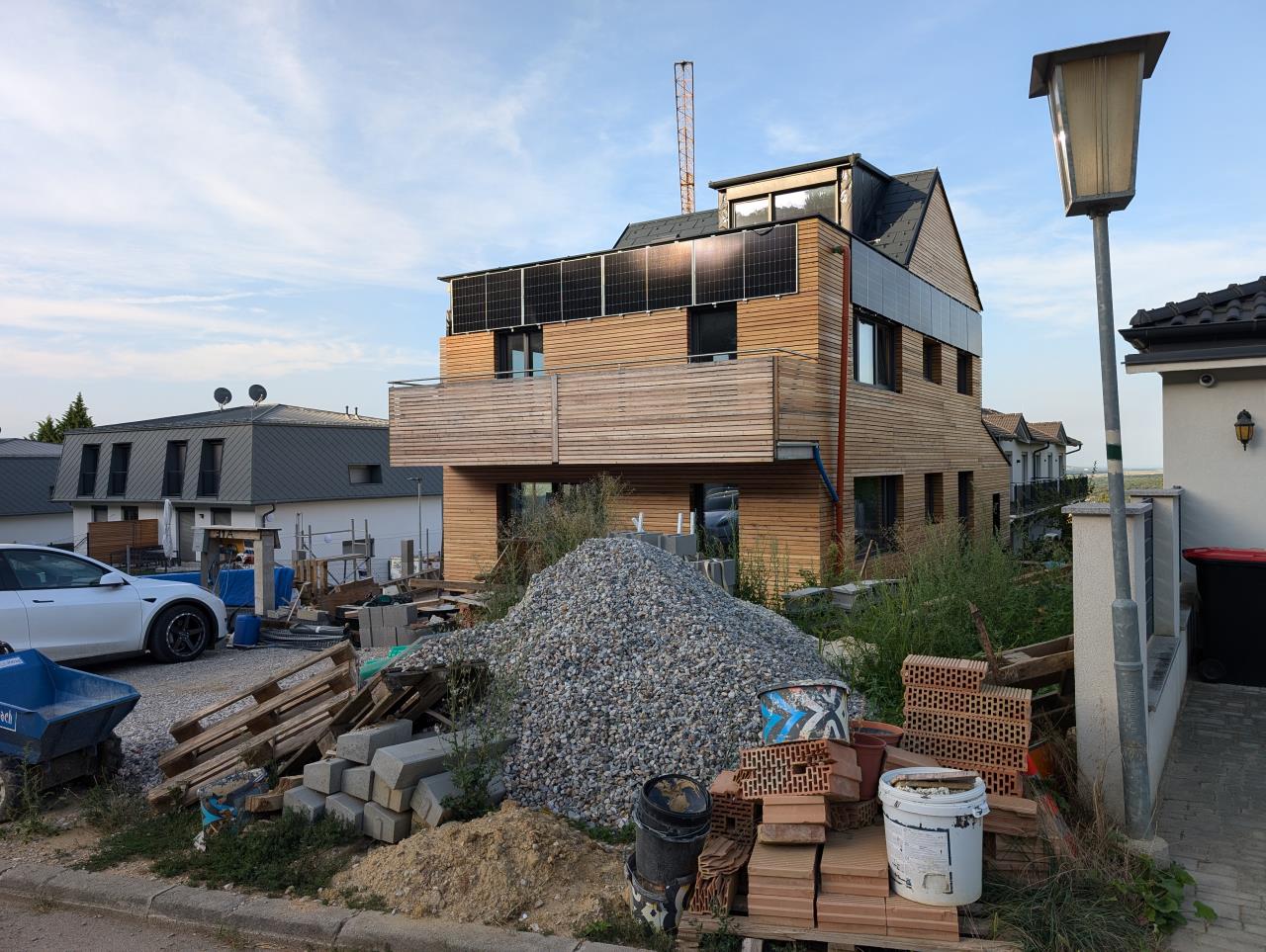 Die Fassade selber ist ein 50-er hochporöser Ziegel mit Thermoputz. Attikas sind aber aus Ytong, dieses brüchige und feuchtigkeitsempfindliche Zeugs wollen wir noch weniger anbohren...