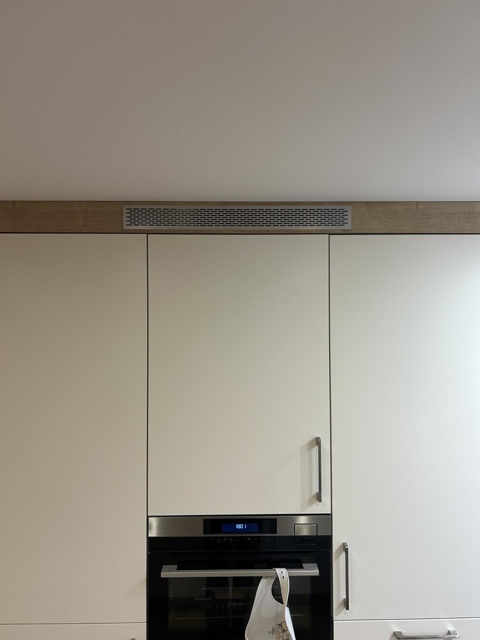 Ich habe gerade mit Roland geredet. Ja, bei dir ist es ein Sonderfall. In der Speis, also von der Hinterseite kann man den flexiblen Schalldämpfer abstecken, um an den Filterschwamm zu kommen. Dieser sollte dann regelmäßig kontrolliert, gewaschen, bzw. gegebenenfalls ausgetauscht werden. Ohne Schwamm bzw. Drosselung wäre der Volumenstrom in der Küche zu groß geworden. Wir haben öfters die Herausforderung, dass wir über den Küchenschränken eine Abluft platzieren sollen, aber praktisch nur mehr ein schmaler Schlitz oberhalb dafür zur Verfügung steht. Da gibt es leider keine fertige Lösung und man muss improvisieren.