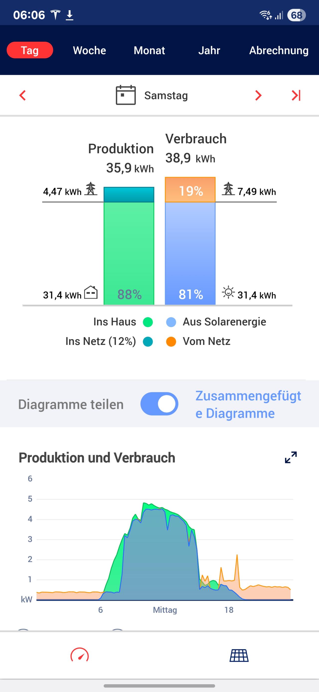 Wenn deine PV halt maximal 4-5kW hergibt jetzt Ende August, das dafür über einen großen Bereich vom Tag, dann macht es wenig Sinn, alle Zeiten wo man weniger als 3.7kW hat (3phasig 6A) liegenzulassen. Anbei zB eine Kurve aus den letzten Tagen bei uns. Da macht es durchaus auch Sinn die 1phasigen Bereiche mitzunehmen statt um 6ct (oder bald 0ct? ) einzuspeisen. Wo die 6A 3phasig erreicht werden wird eh so geladen. |