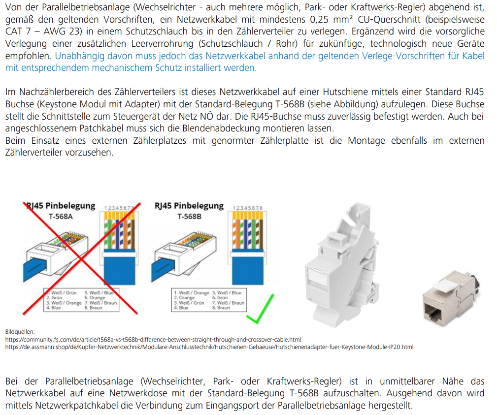 Das steht auf den letzten 2 Seiten der Netz NÖ Parallellaufbedingungen beschrieben: https://www.netz-noe.at/Download-(1)/Verteilernetzbedingungen-Strom/Parallellaufbedingungen.aspx Du brauchst ein Keystone Modul auf Hutschiene im Zählerkasten und am anderen Ende (bei den Wechselrichtern) ebenfalls eine Netzwerkdose. Was du dann nach der Netzwerkdose machst (mit Park- oder Kraftwerks-Regler, Ruhestromschaltung usw.) bleibt dir überlassen. Und ob das (nach der Netztwerkdose) dann so abgenommen wird, ist dann Willkür von dem jeweiligen Netz Nö Bearbeiter, bei mir wurde z.B. verlangt, dass nicht verwendete Digitaleingänge vom WR WR [Wechselrichter] deaktiviert sind, obwohl das auch nirgends beschrieben/gefordert ist.... |