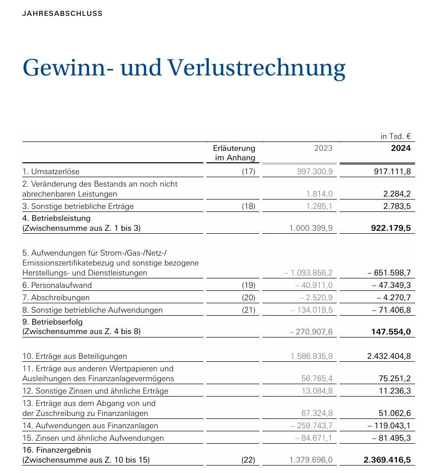 Das ist interessant, danke. Bei 11,8 ct / kWh Erlös wären das bei 34 TWh ca. 4 Mrd Euro. Diese Position gibt es in der Bilanz jedoch nicht. https://www.evi.gv.at/api/dateien/bmj-6kx/anhang/jaufdpv3.bxq |
